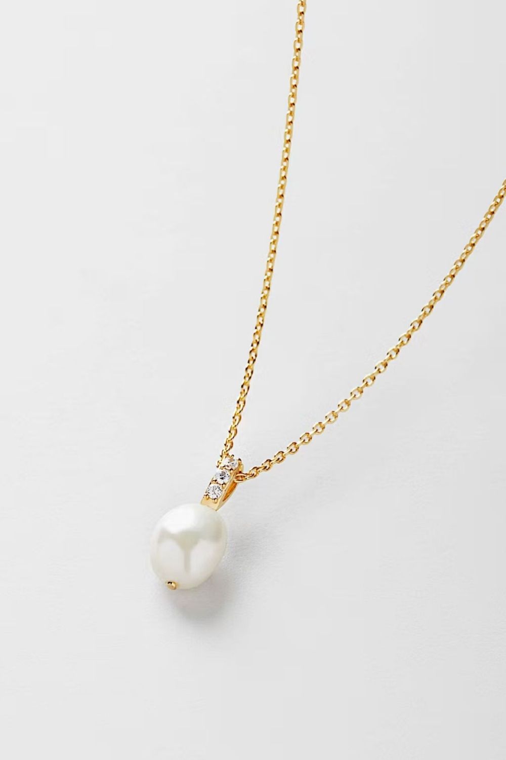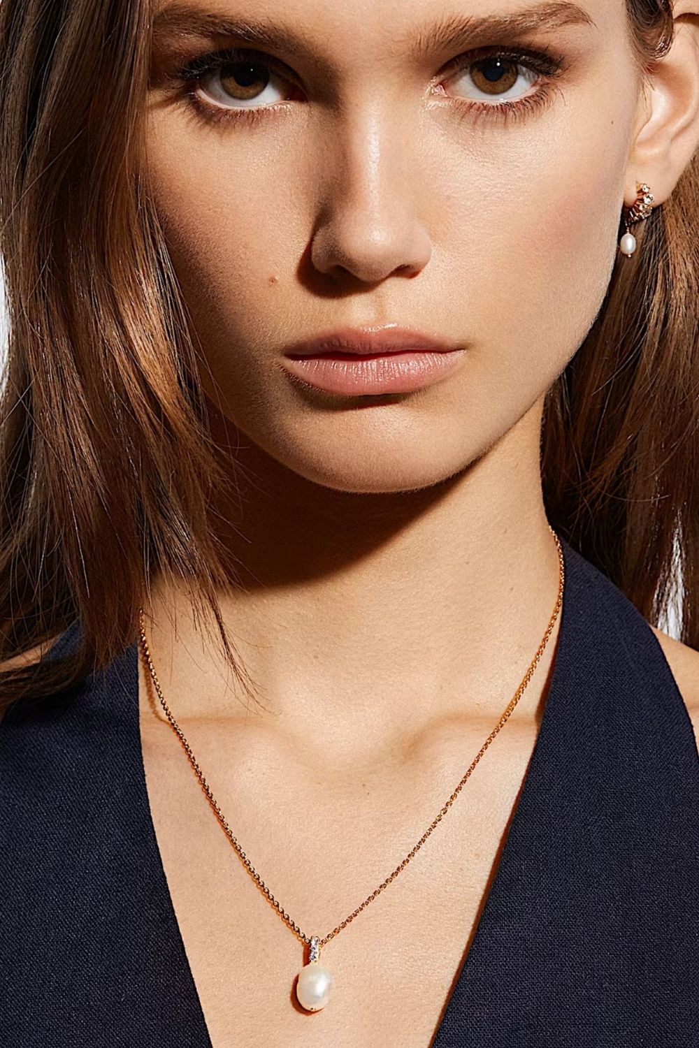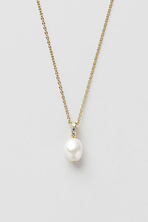 Pärlhalsband dekorerat med klara Cubic Zirconia stenar och en äkta sötvattenspärla, förgyllt med äkta 24k guld och har en kärna av äkta sterling silver 925. Varje pärla är unik i form, färg och storlek. Detta kan göra att ditt pärlsmycke skiljer sig något från vad du ser på produktbilden.