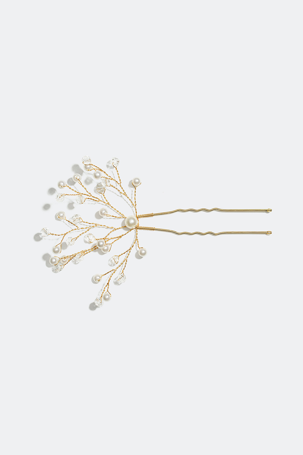 Hårnål i guldfärgad metall med tvinnade metalltrådar som är vackert dekorerade med vita pärlor- och transparenta stenar i plast.