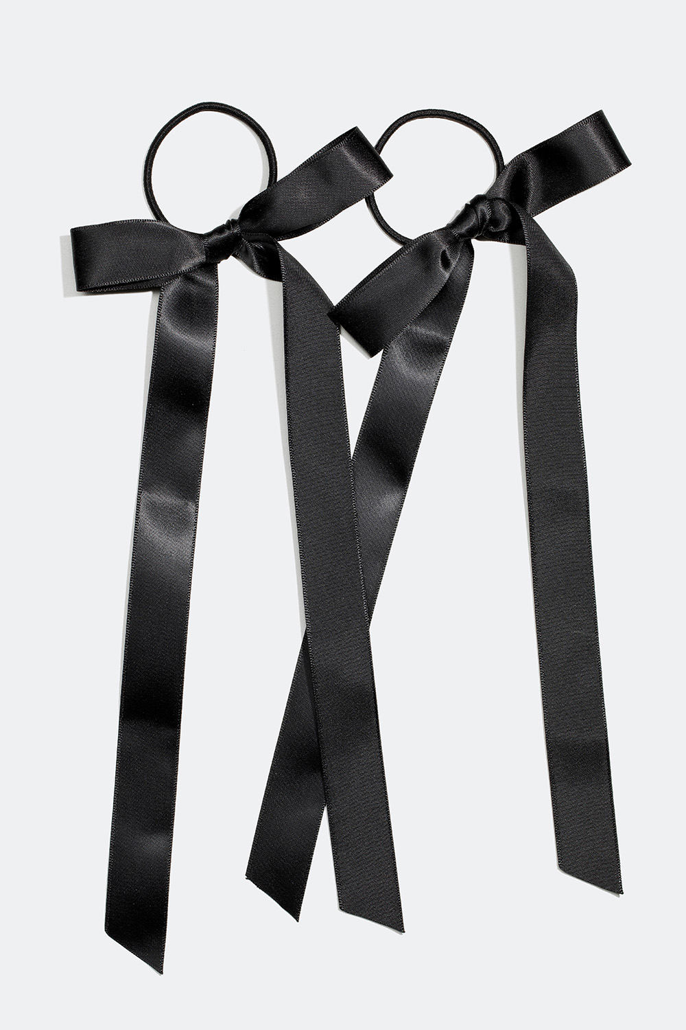 2-pack med svarta hårsnoddar som har varsin svart rosett i sidenimitation med långa band. Ett par dekorativa tofsar som passar perfekt till mer detaljrika frisyrer.