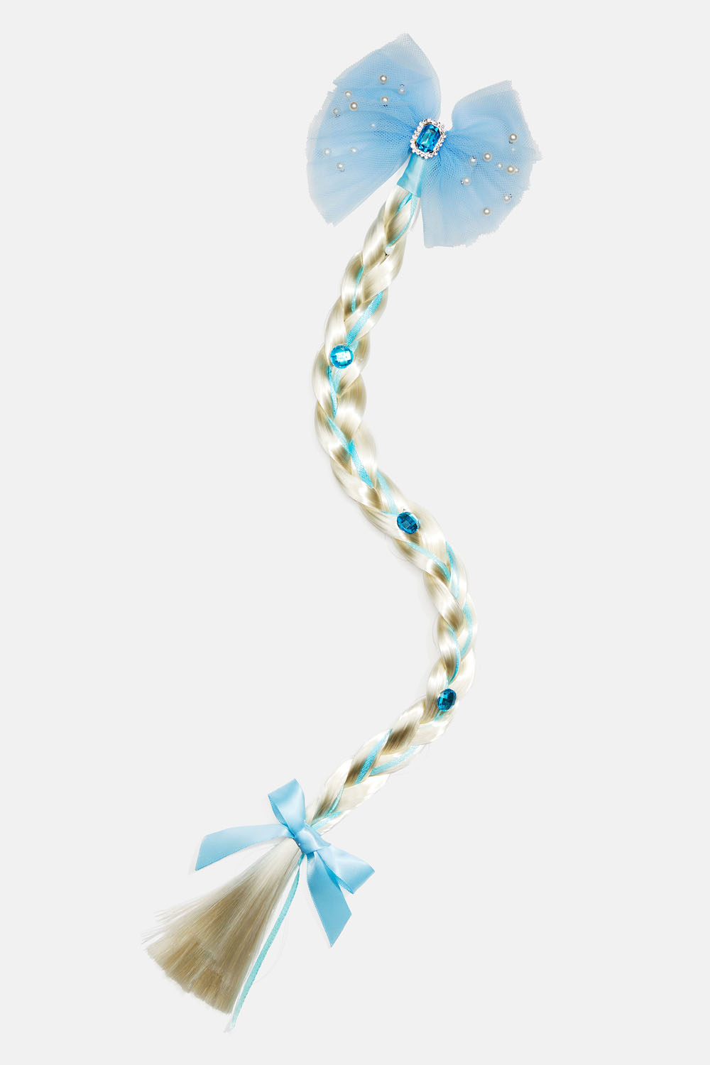 Hårspänne med blå tyllrosett och lång blond fläta dekorerad med pärlor och blå plaststenar.
