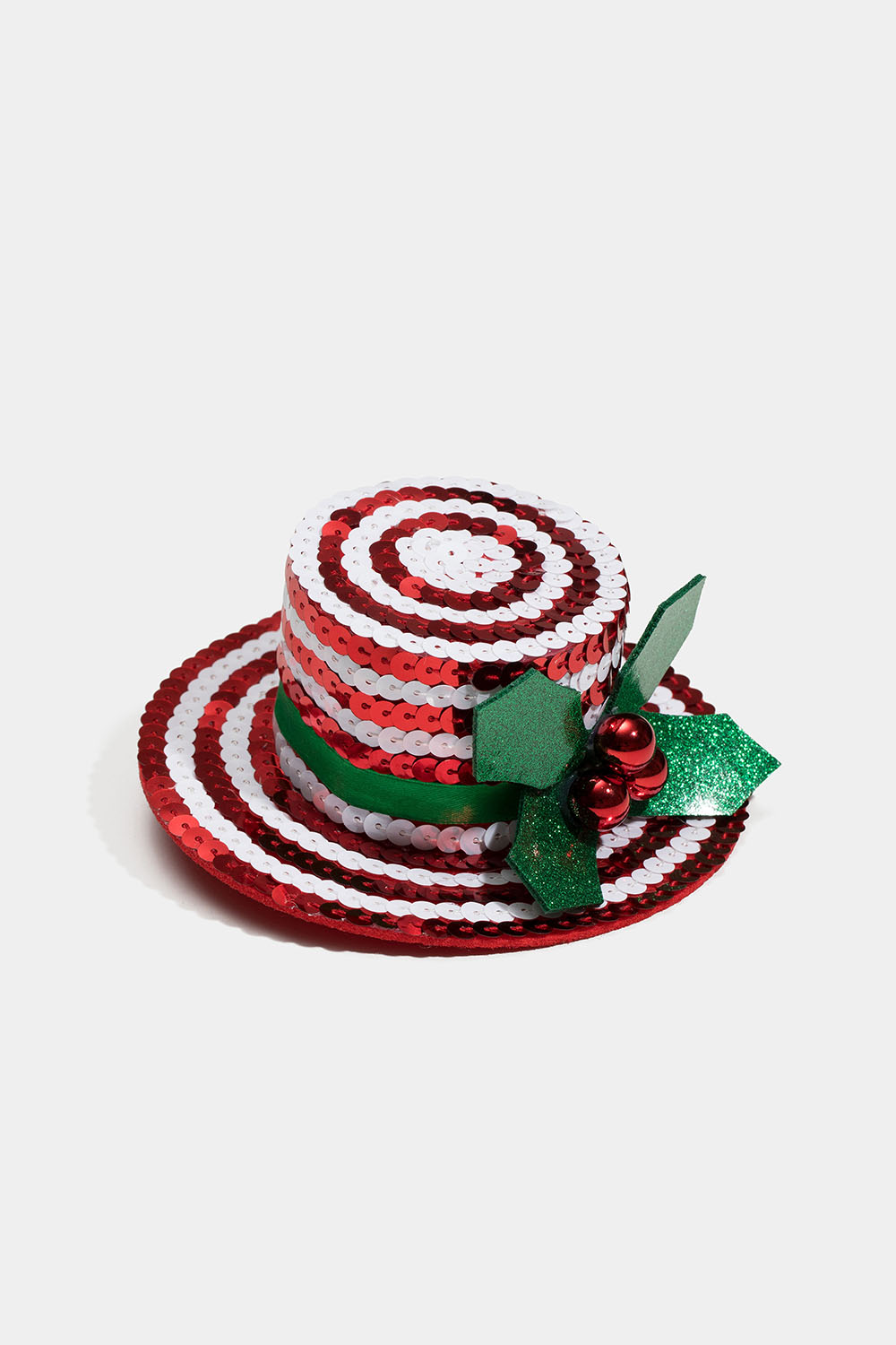 Hårspänne med en liten röd och vit randig paljettklädd hatt och glittrig mistel