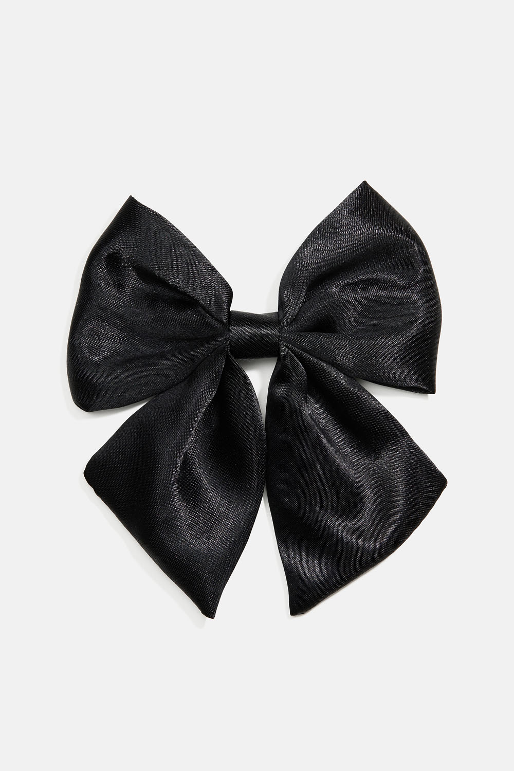 Hårspänne med näbbklämma och rosett i svart glansigt tyg.