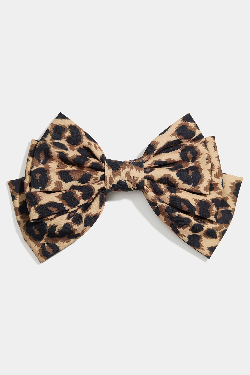Hårspänne med stor rosett i leopardmönstrat tyg.