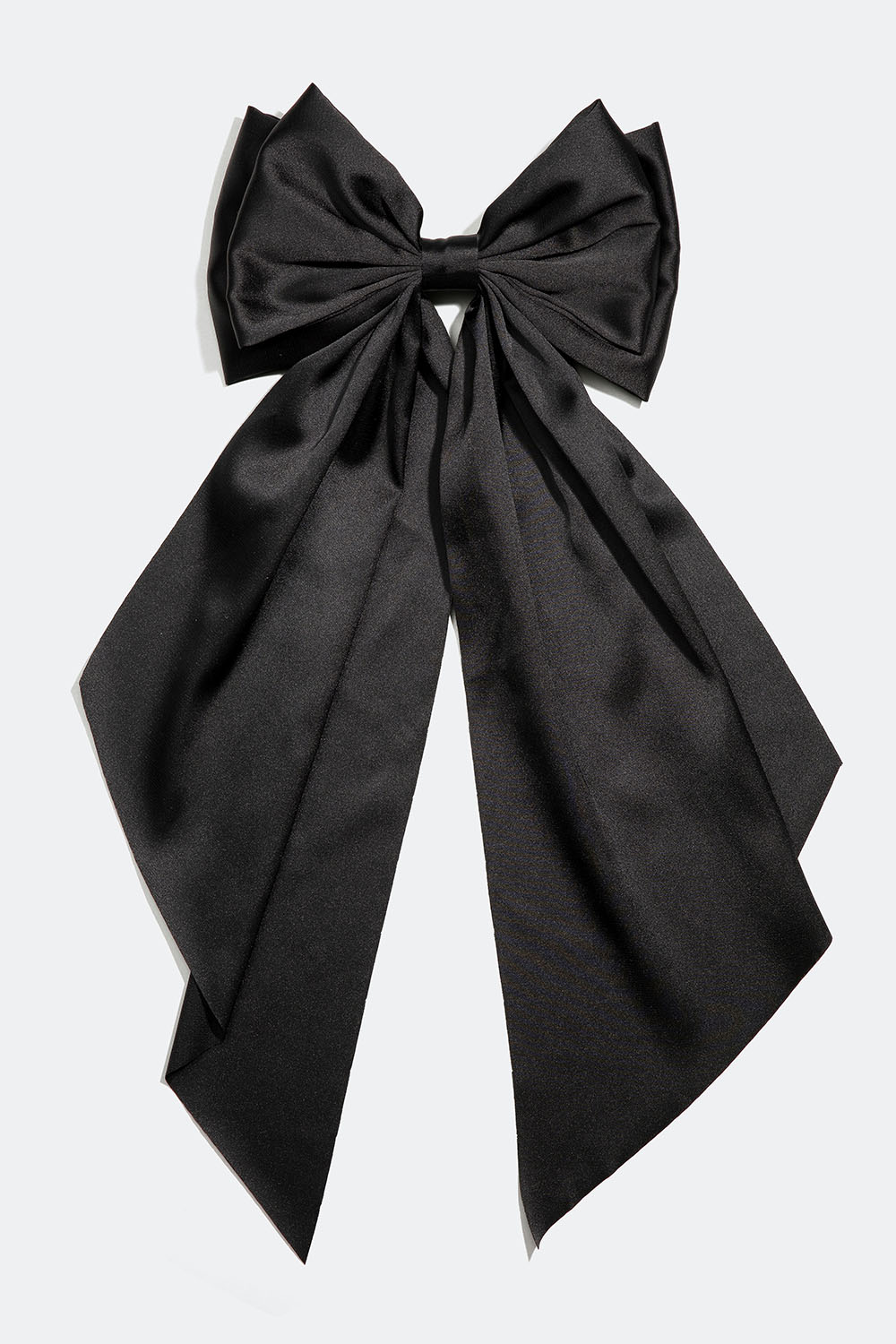 Hårspänne med stor rosett i svart sidenimitation med långa band. En dekorativ håraccessoar med glänsande tyg som är en fin detalj till din frisyr samtidigt som den skonsamt håller håret på plats. Detta är den perfekta håraccessoaren till studenten, balen samt sommarens alla fester och bröllop.