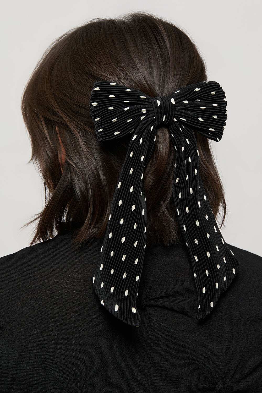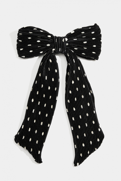 Hårspänne i metall med en rosett i svart plisserat tyg och vita prickar.