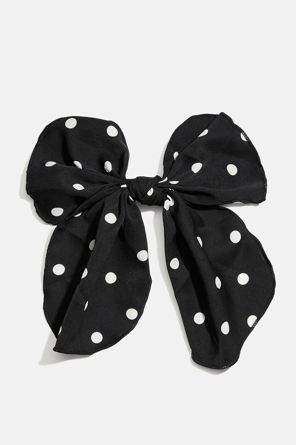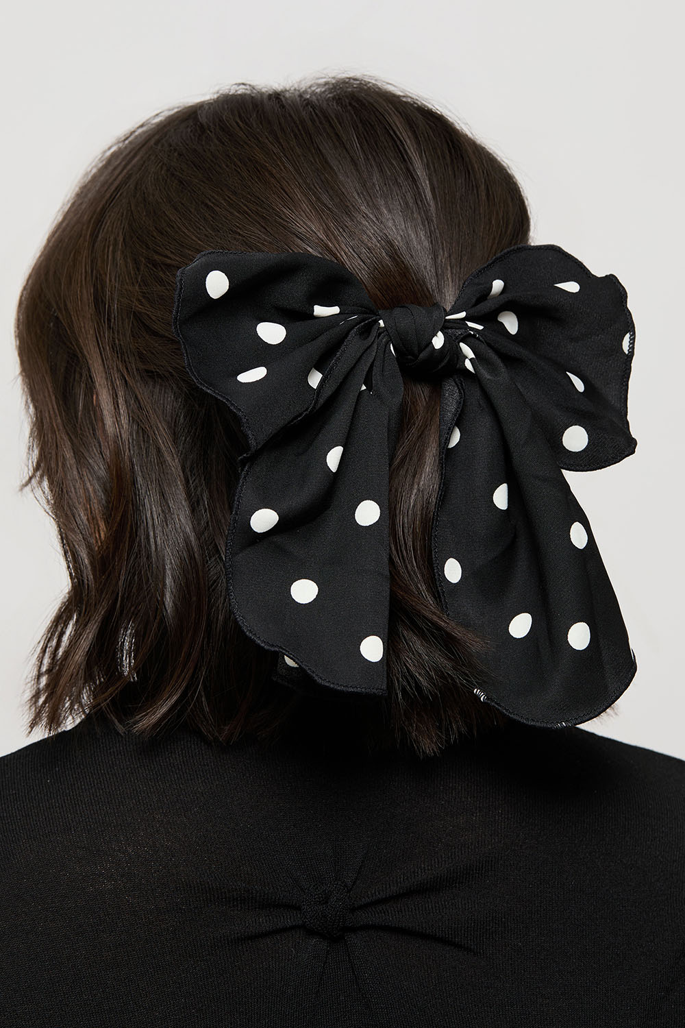Hårspänne i metall med en dekorativ rosett i svart tyg med vita prickar.