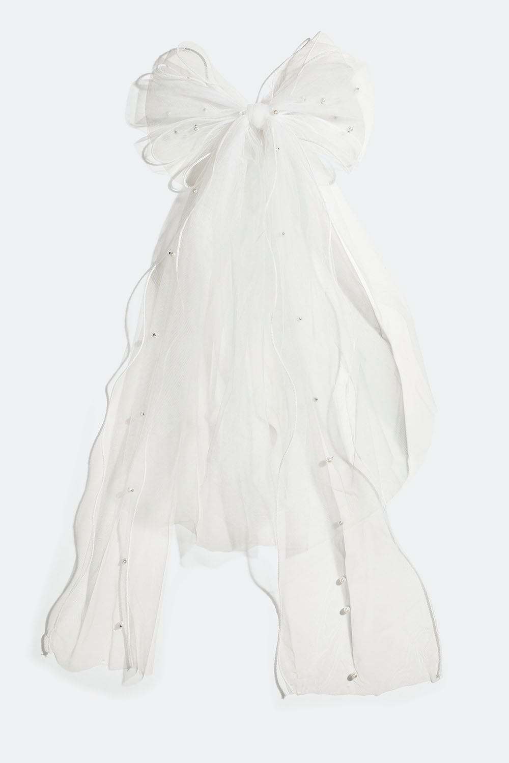 Dekorativt hårspänne med stor rosett i vit organzatyg med små vita pärlor. En fin detalj till din frisyr och den perfekta håraccessoaren till exempelvis ett bröllop.