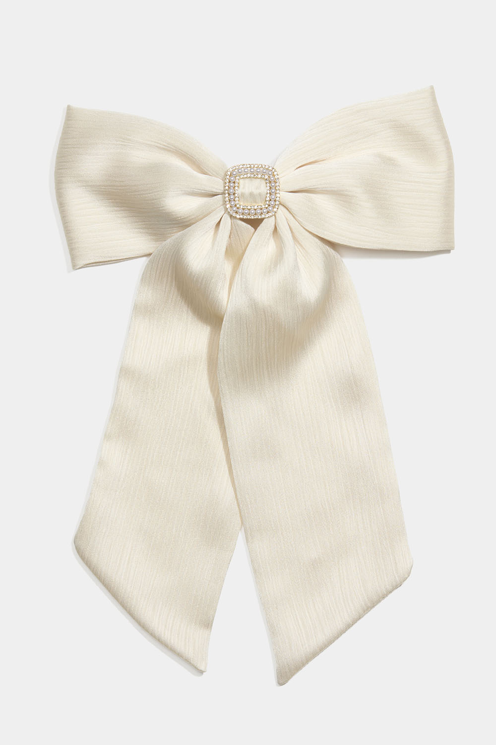 Hårspänne i metall med en stor vit rosett i plisserat tyg och en kvadratisk dekoration med strass och vita pärlor.