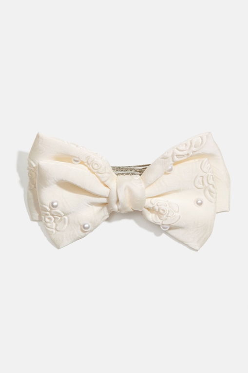Hårspänne med vit dubbel rosett i glansigt tyg med präglade rosor och vita pärlor.