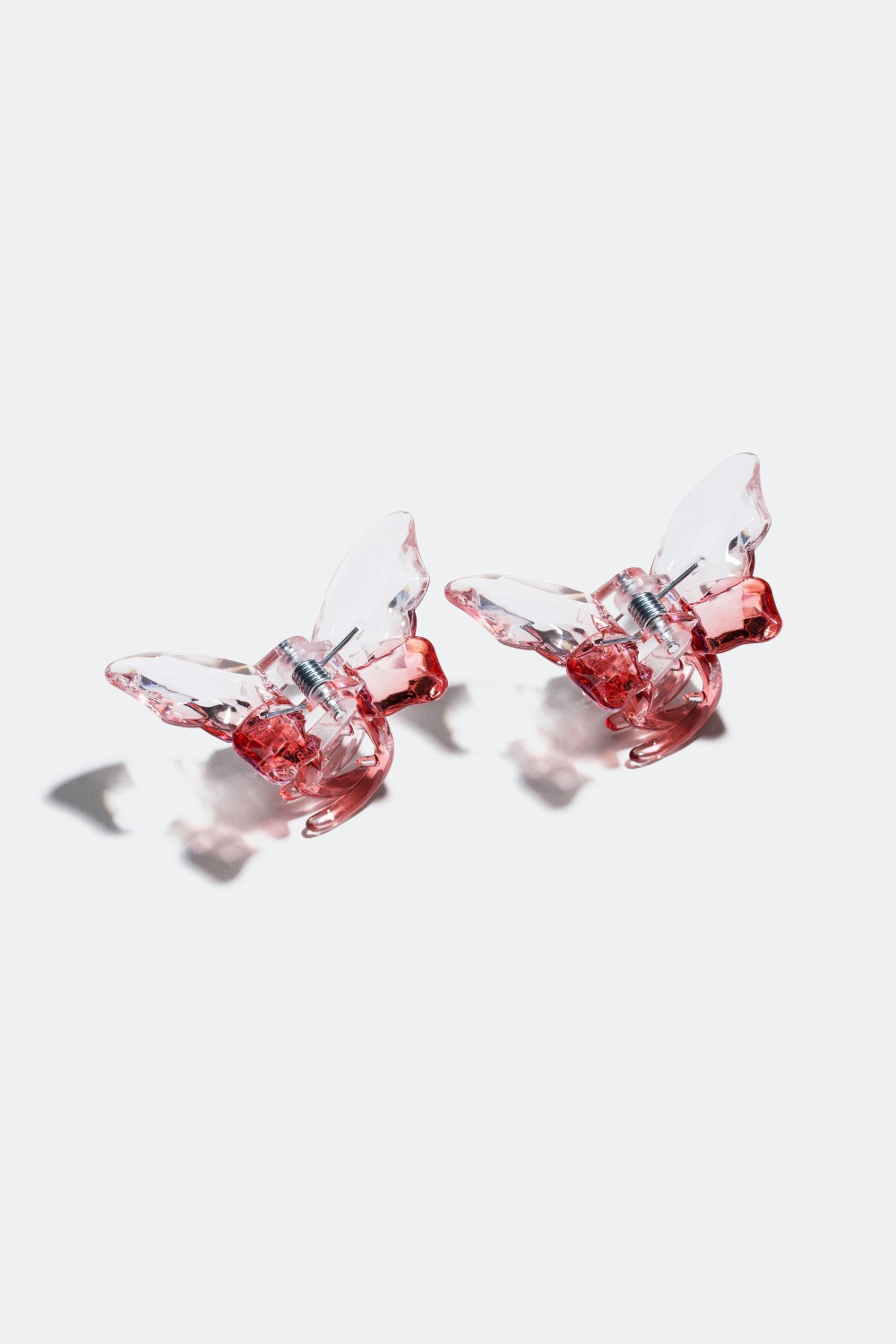 Två hårspännen i form av fjärilar i genomskinlig plast med rosa toner.