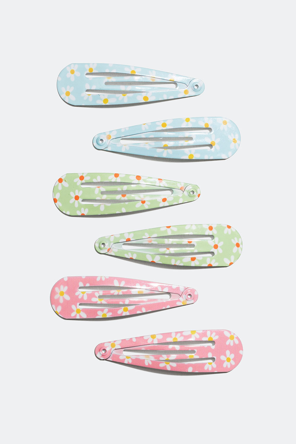 6-pack med hårspännen som kommer i en mix av blått, rosa och grönt med blommönster.