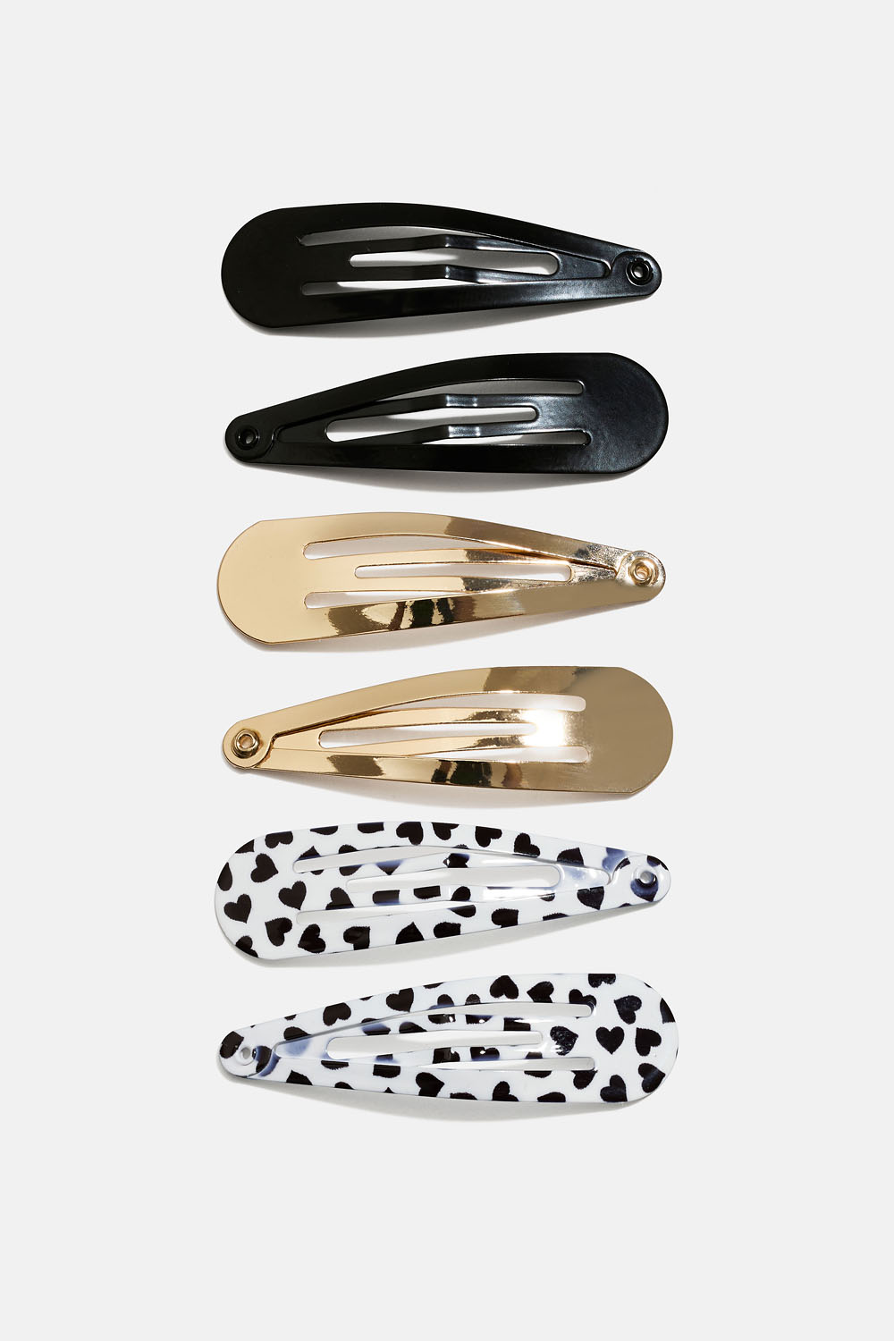 Hårspännen i svart, guld och hjärtmönster, 6-pack