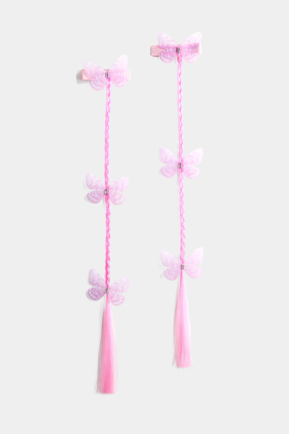 Två hårspännen med hängande flätor i rosa. Flätorna har dekorativa fjärilar i lila med plastdiamanter i mitten.