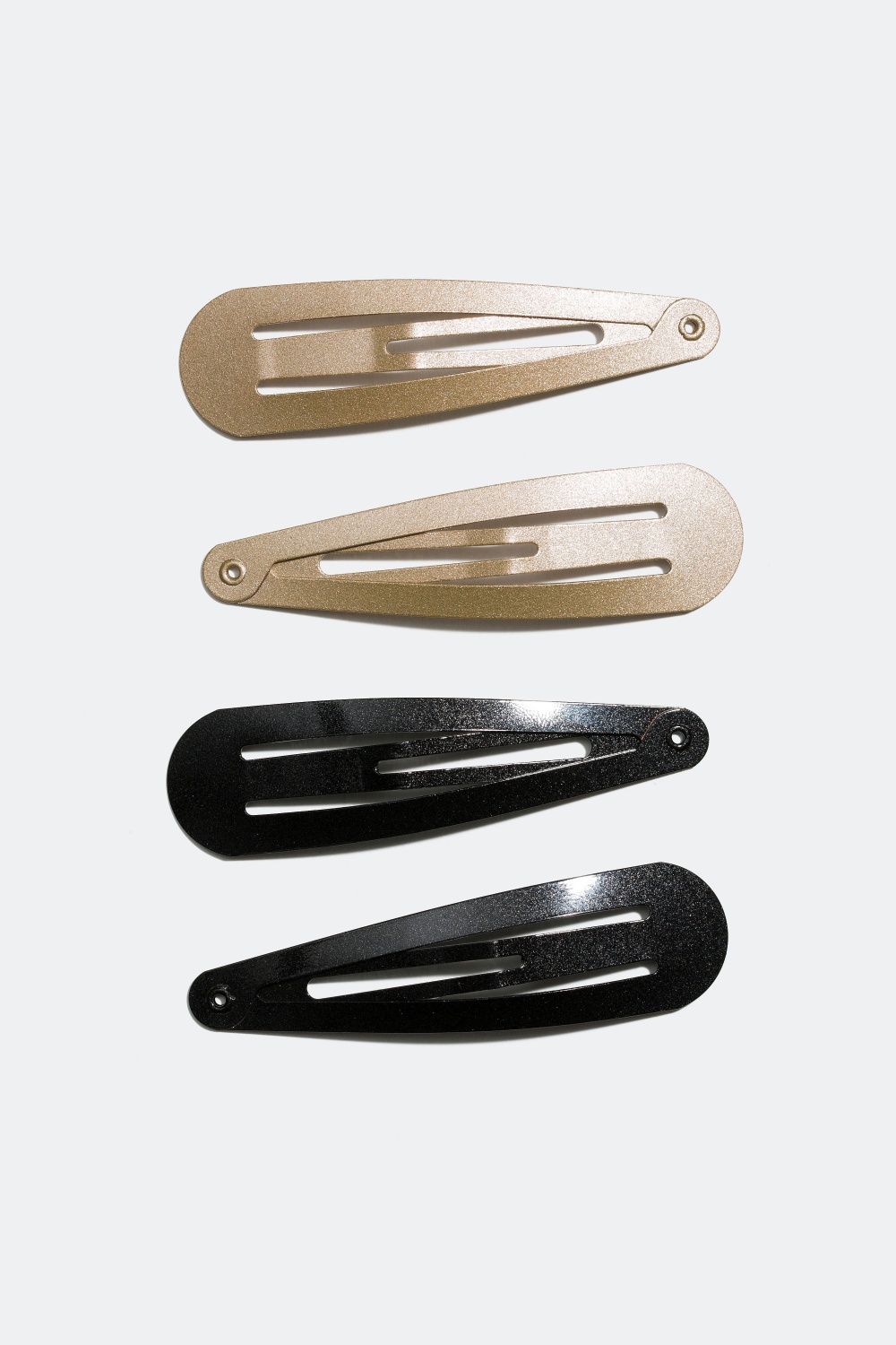 2-pack hårspännen med matt glittrig yta, kommer i svart och guld.