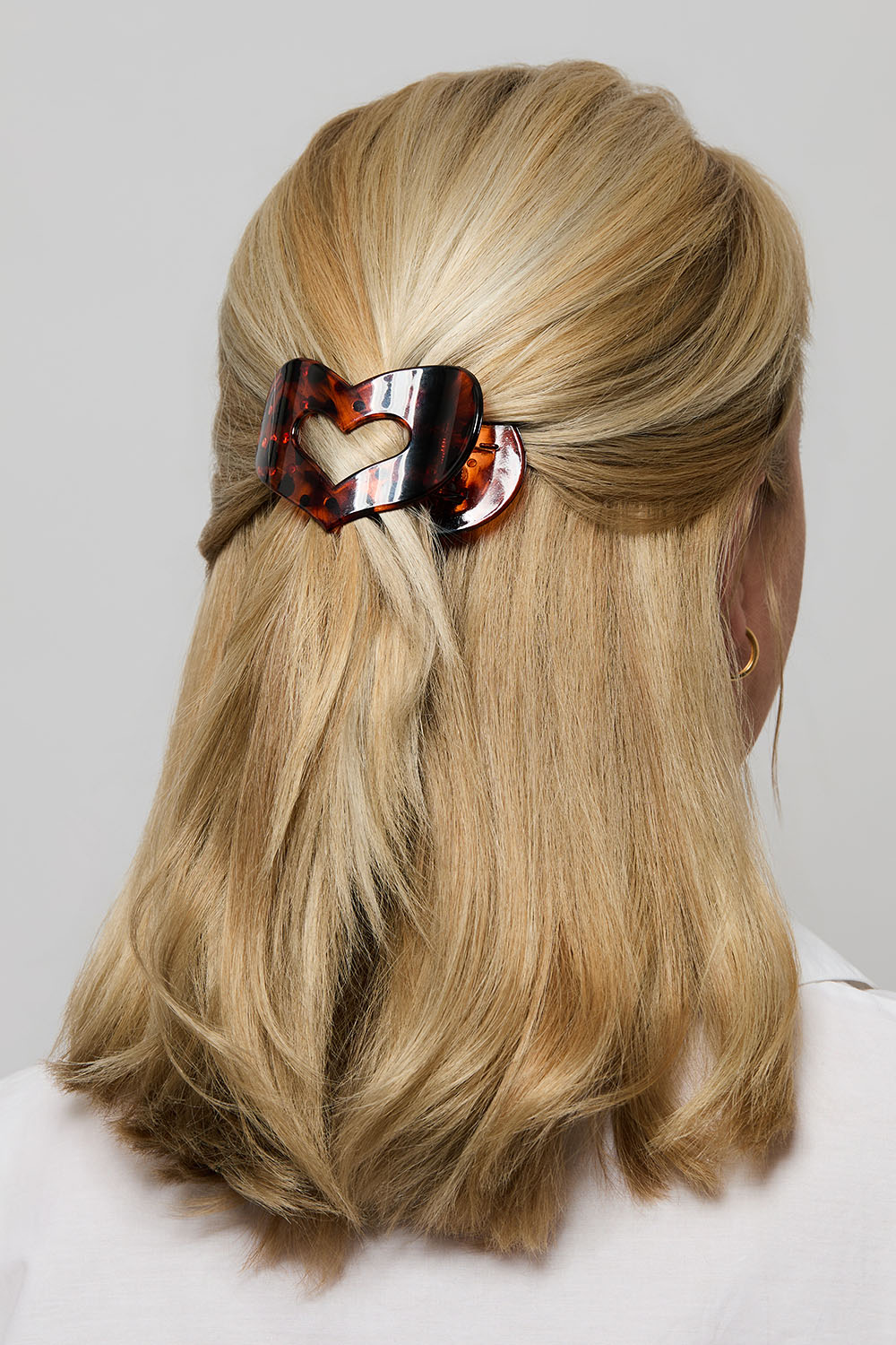 Platt hjärtformad hårklämma i brunt tortoisemönster. Du kan luta dig tillbaka i exempelvis bilen eller i soffan utan att något sticker i bakhuvudet. Du fäster klämman ifrån sidan och är mycket lätt att använda.