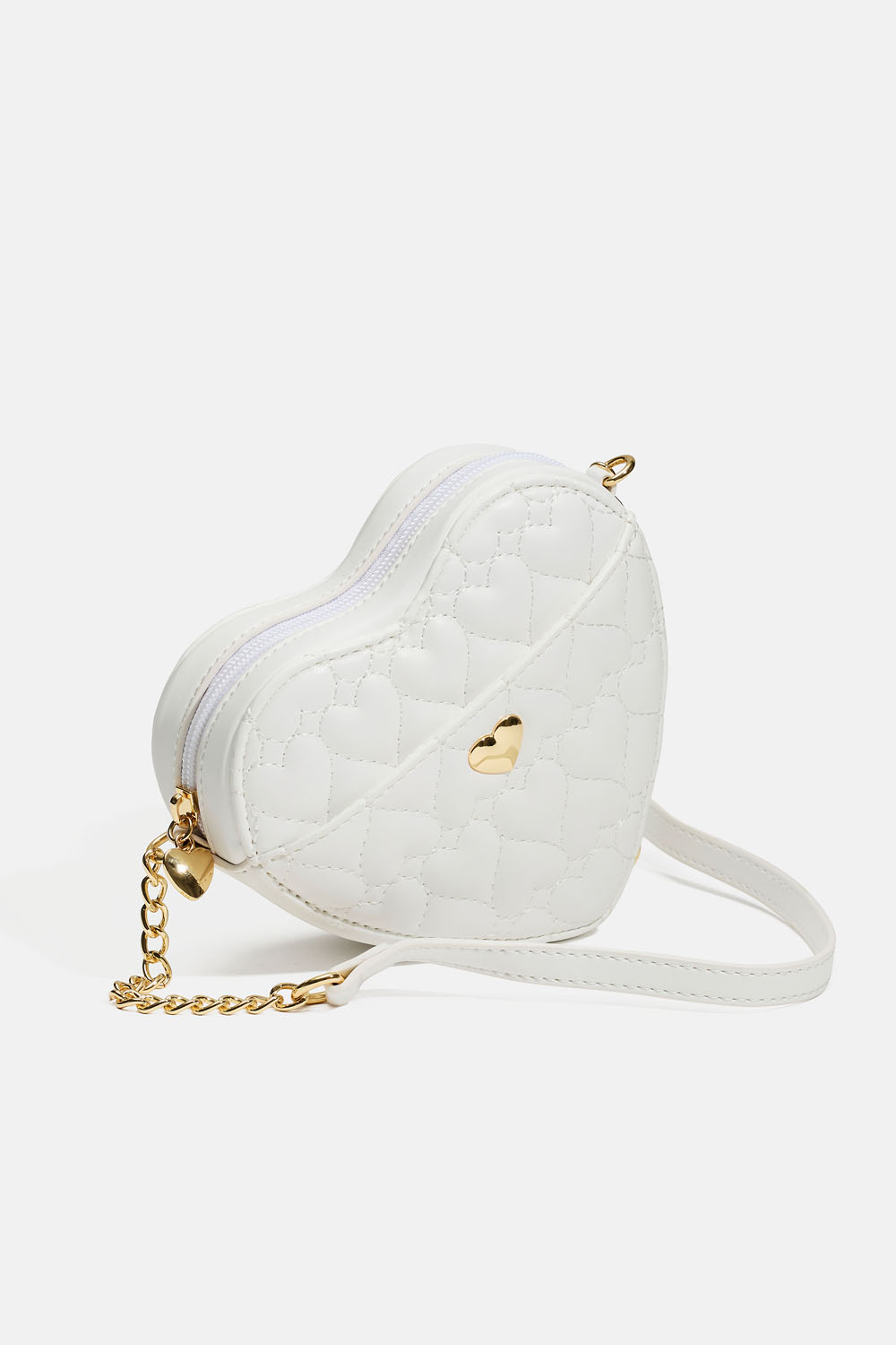 Vit quiltad handväska för barn i hjärtform. Väskan har en axelrem I guldfärgad kedja och stängs med dragkedja. Väskan har en stort fack och ett mindre på framsidan.