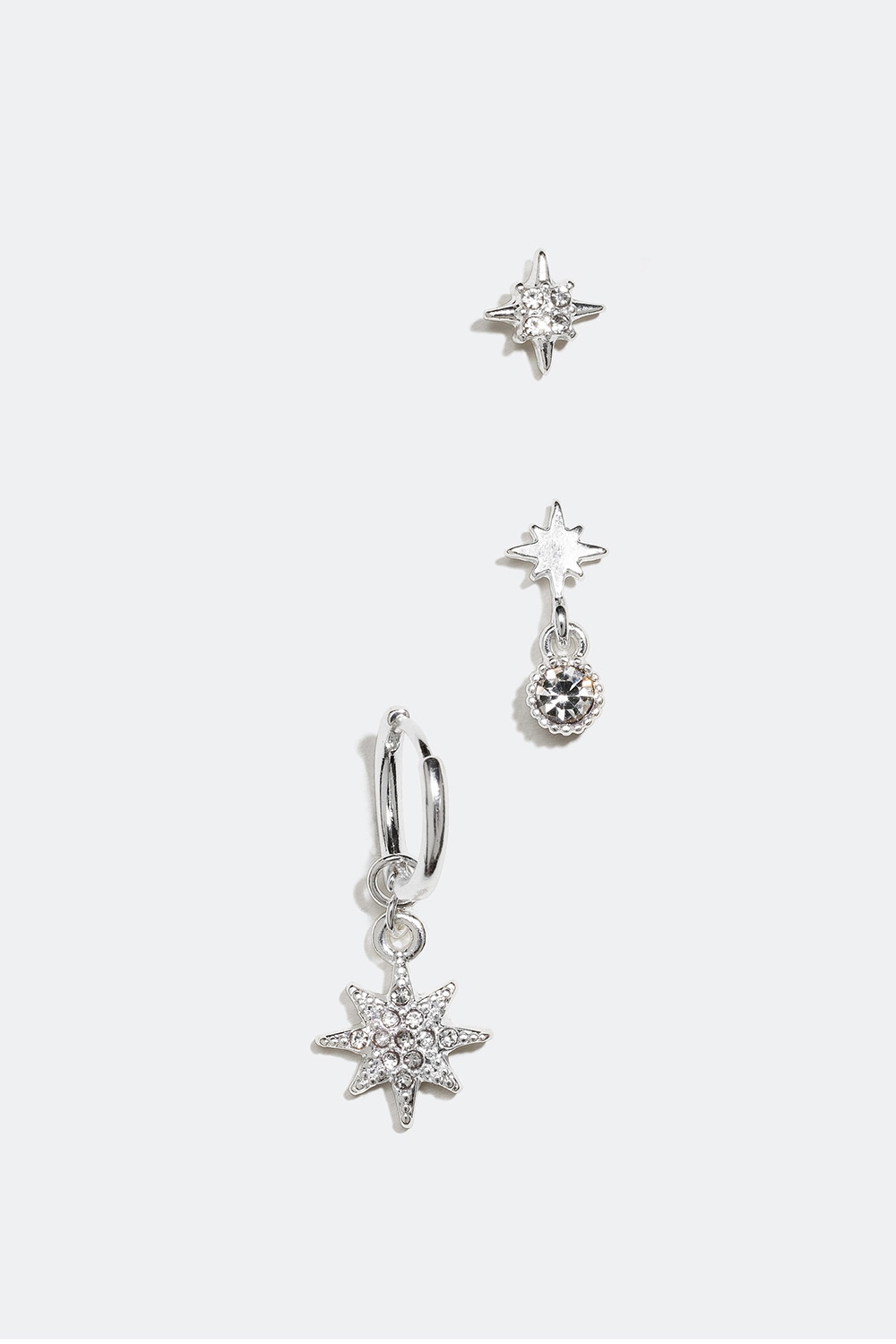 3-pack med en två studs med motiv av stjärnor och glasstenar, samt en liten hoop med ett stjärnhänge dekorerat med glasstenar. Ett perfekt multipack av skimrande örhängen som passar att använda både till vardags som till fest. Örhängena kommer som singlar och är fina att använda både i kombination med andra örhängen samt ihop om du har flera hål i ett öra.
