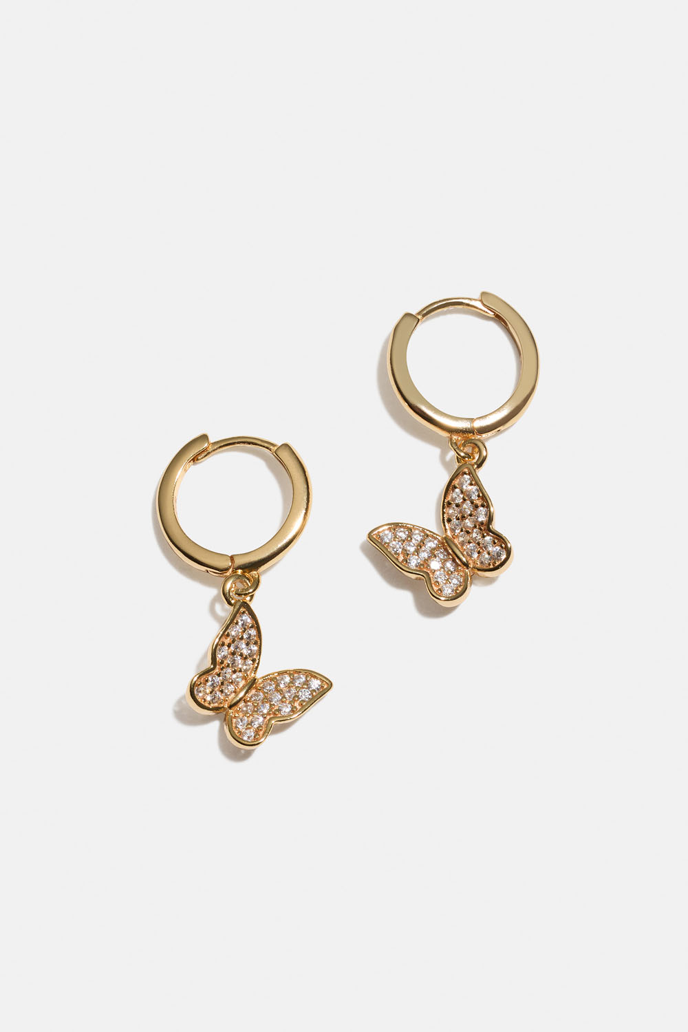 Små hoops i 18k guldpläterat äkta silver med hängande fjärilar dekorerade med Cubic Zirconia stenar.