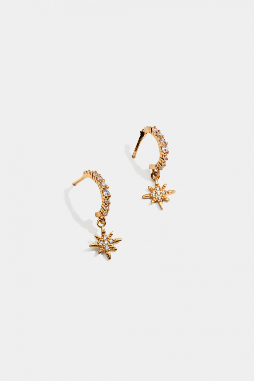 Små hoops i 18k guldpläterat äkta silver dekorerade med Cubic Zirconia stenar i olika storlek och hängande stjärnor.