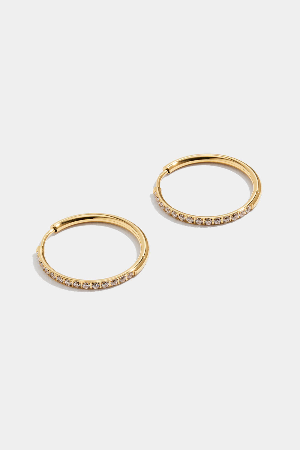 Hoops i högpolerat rostfritt stål som är PVD-pläterat med 18K guld och Cubic Zirconia stenar.