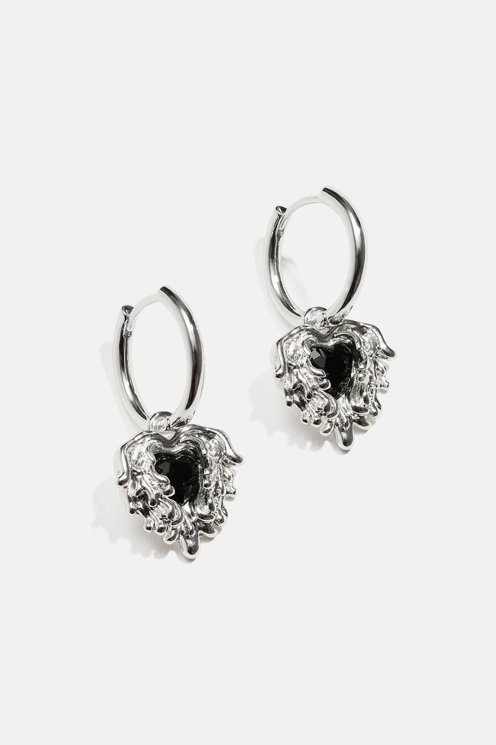 Hoops med hängande hjärtan i smält design och svart glassten.