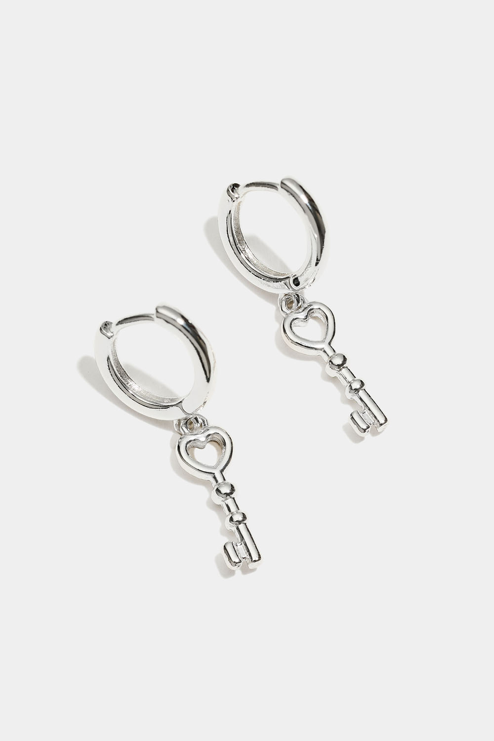 Små hoops i silverfärgad metall med en hängande nyckel med hjärtform.