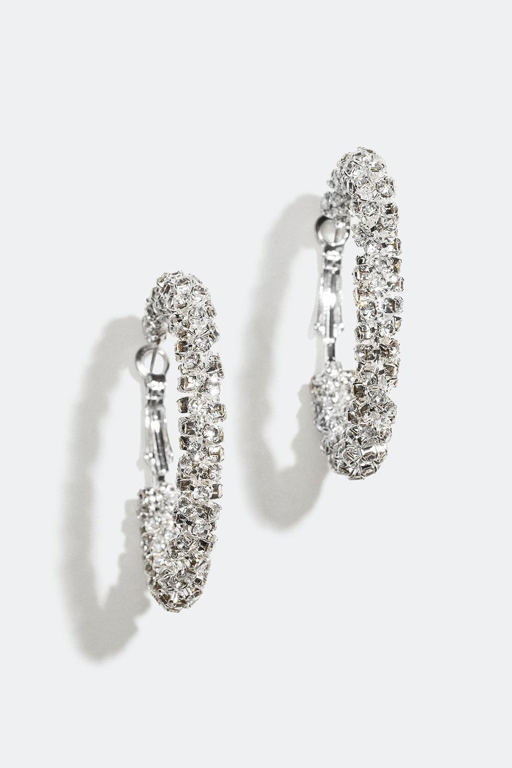 Hoops i silverfärgad metall som är dekorerade med skimrande glasstenar i en tvinnad design. Ett Ett par glänsande örhängen med strass som är perfekta att använda till fest och andra get-togethers.