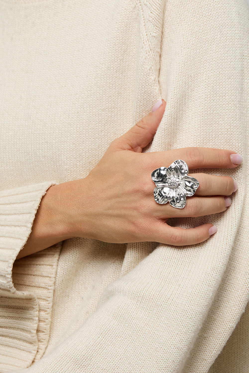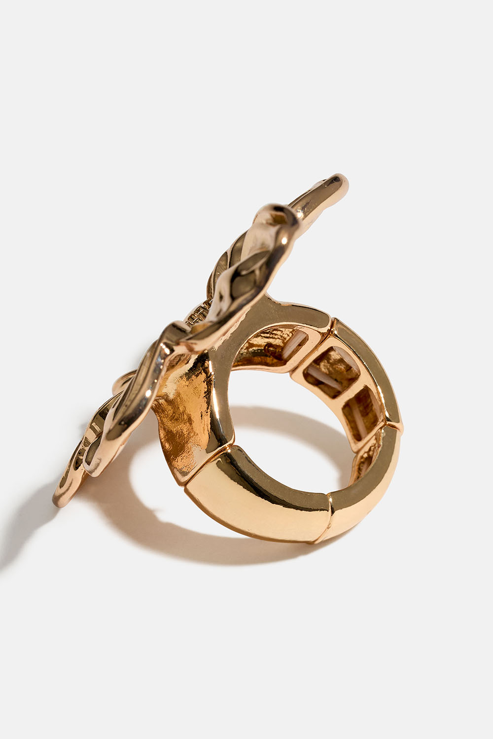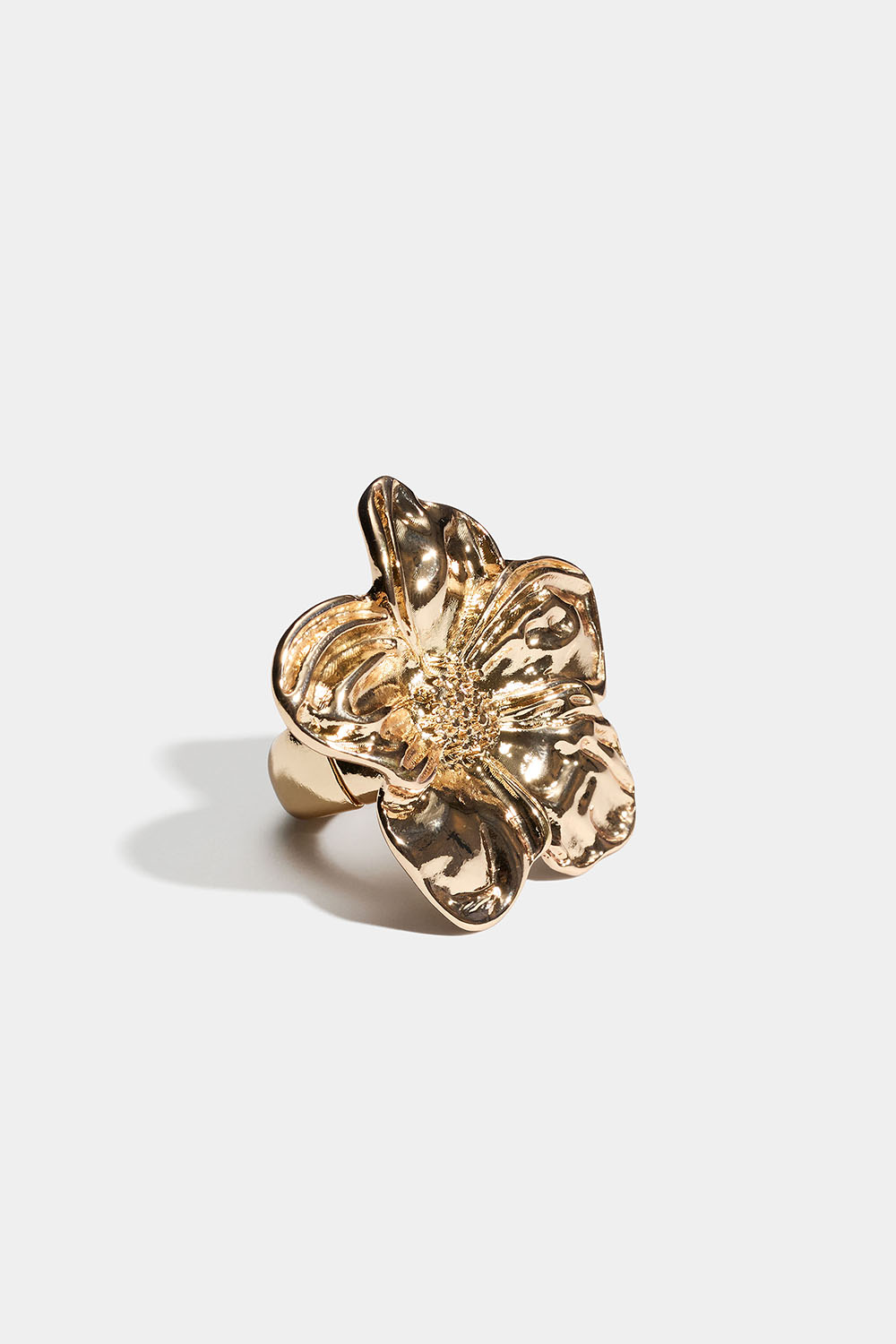 Justerbar ring i guldfärgad metall med stor blomma. Ringen är elastisk och passar flera olika storlekar.