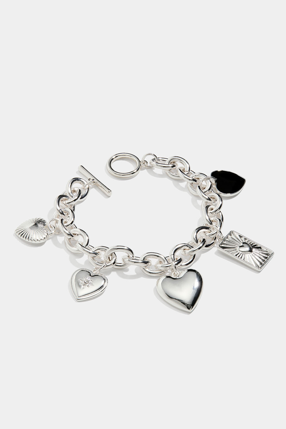Silverfärgat kedjearmband med 5 hängande berlocker i form av hjärtan. Armabandet stängs med en t-bar.