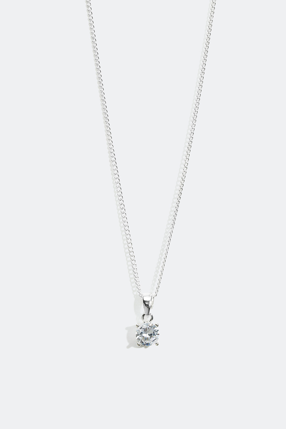Halsband med nätt kedja i silverfärgat metall som har ett dekorativ hänge med en rund glassten.