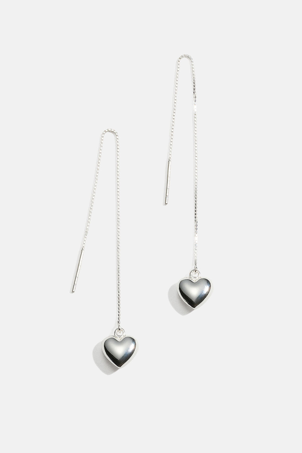 Örhängen i äkta silver med tunn kedja som träs genom örat, med ett hjärta.