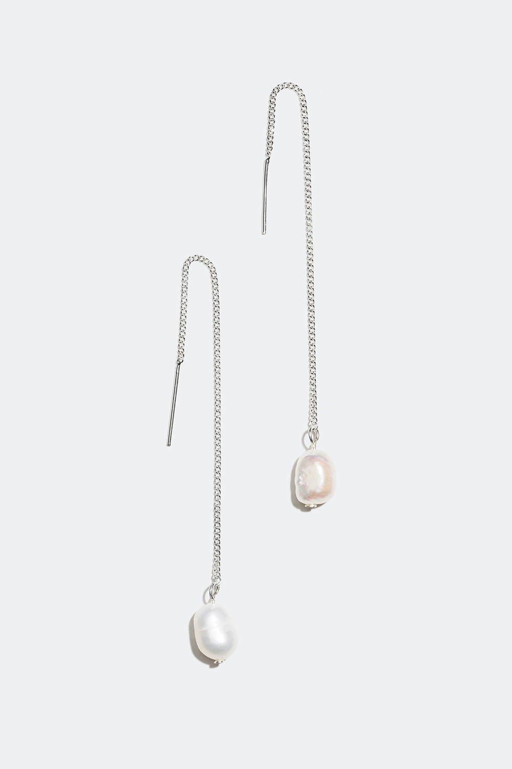 Kedjeörhängen i metall med enkel kedja och en vit plastpärla med oval form i ändarna. Örhänget träs genom hålet i örat så att kedjan hänger både på bak och framsidan av örsnibben.