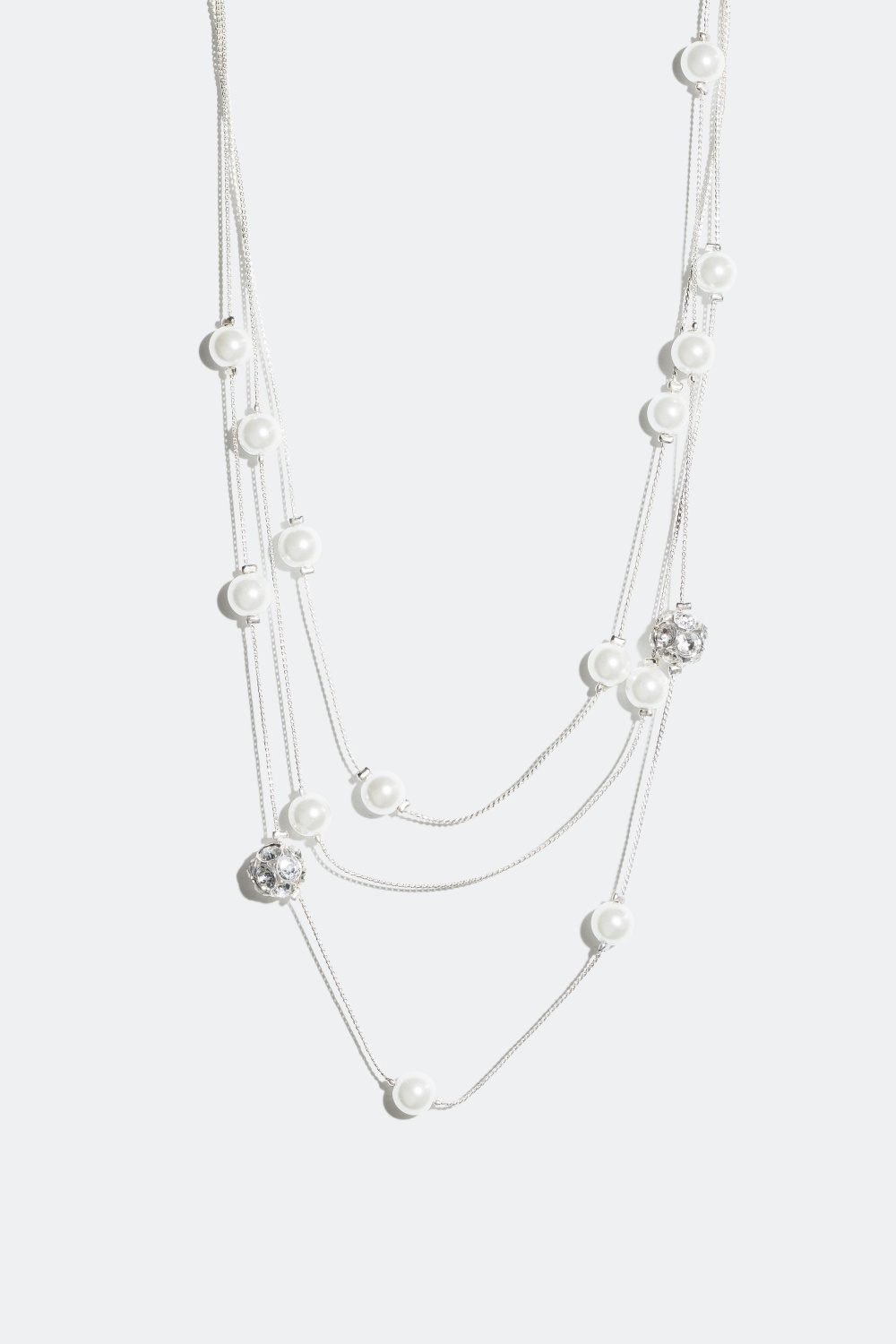 Snyggt pärlhalsband med klassiska vita pärlor och pärlor klädda i vita strasstenar på silverfärgad kedja. Halsbandet är ett lager-på-lager halsband med tre lager. Perfekt halsband att bära på festen.