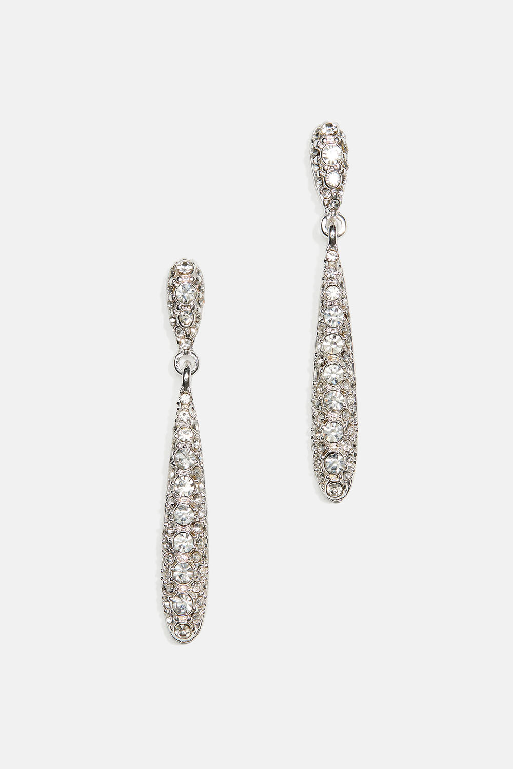 Droppörhängen med avlång form i silverfärgad metall dekorerade med vita glasstenar i olika storlekar.