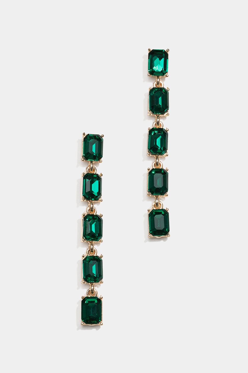 Långa guldfärgade örhängen med fem länkade gröna glasstenar