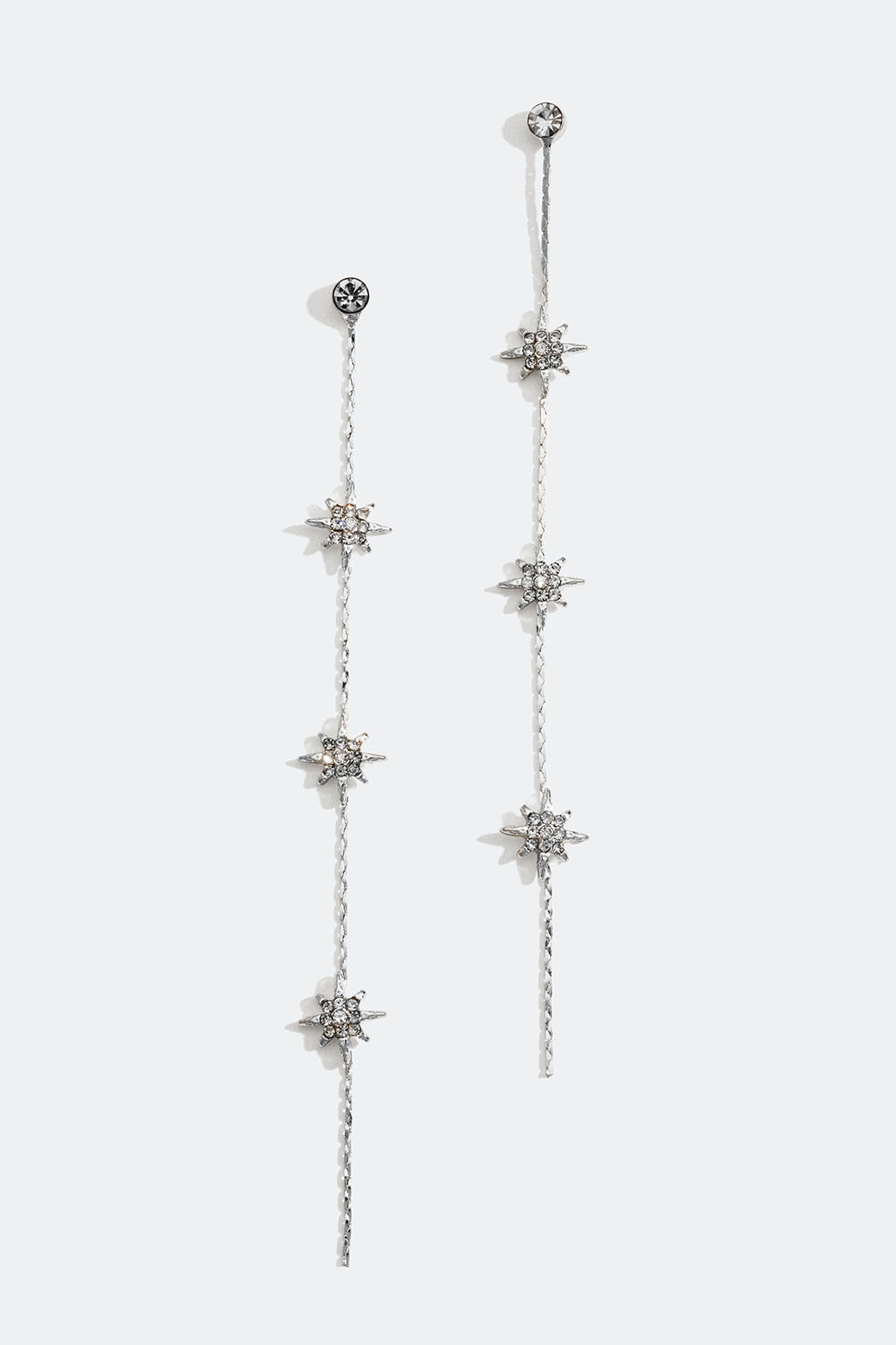 Örhängen med långa kedjor och små stjärnor utsmyckade med glasstenar. Ett par dekorativa örhängen med skimrande detaljer.