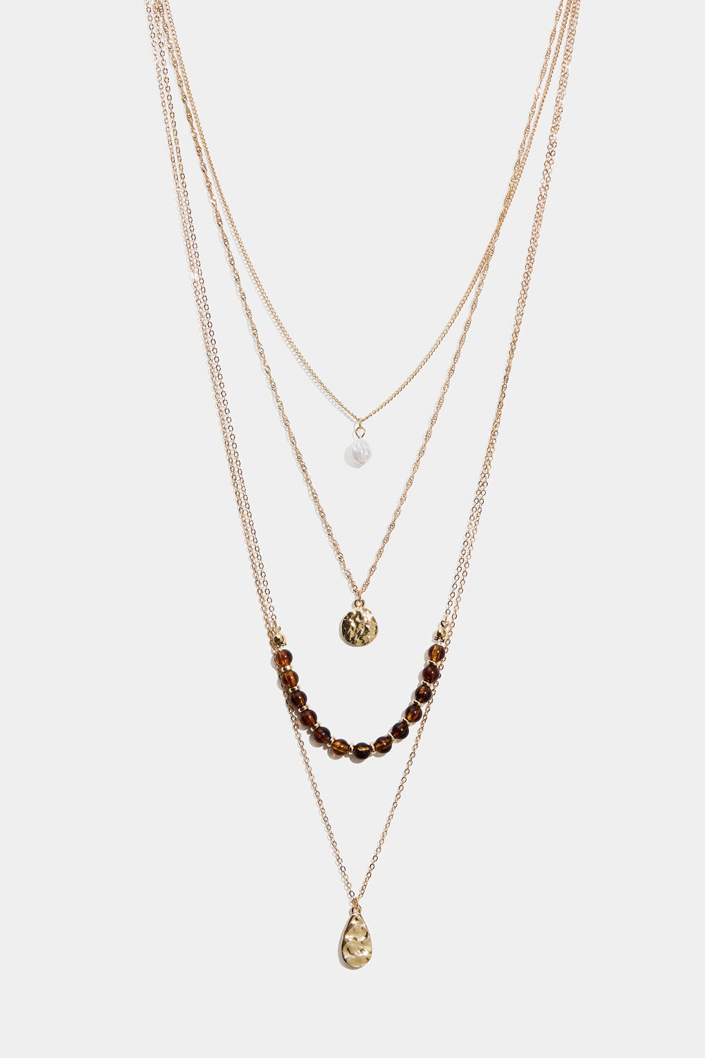 Långt halsband med fyra stycken kedjor i olika design, dekorerade med hängsmycken av metall och pärlor i vitt och brunt.