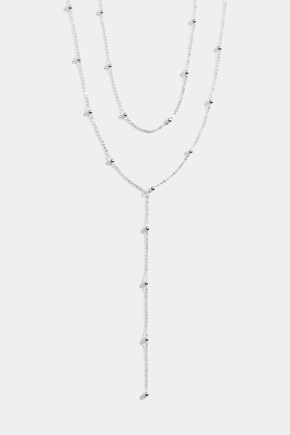 Silverfärgat lariat-halsband med två tunna kedjor med småkulor.