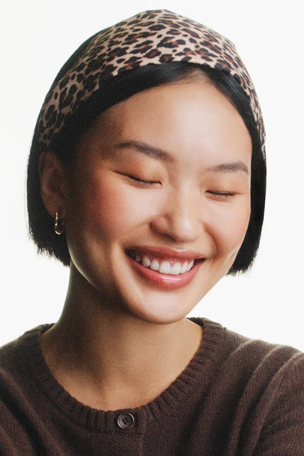 Brett diadem i leopardtyg med taggar på insidan som håller det på plats.