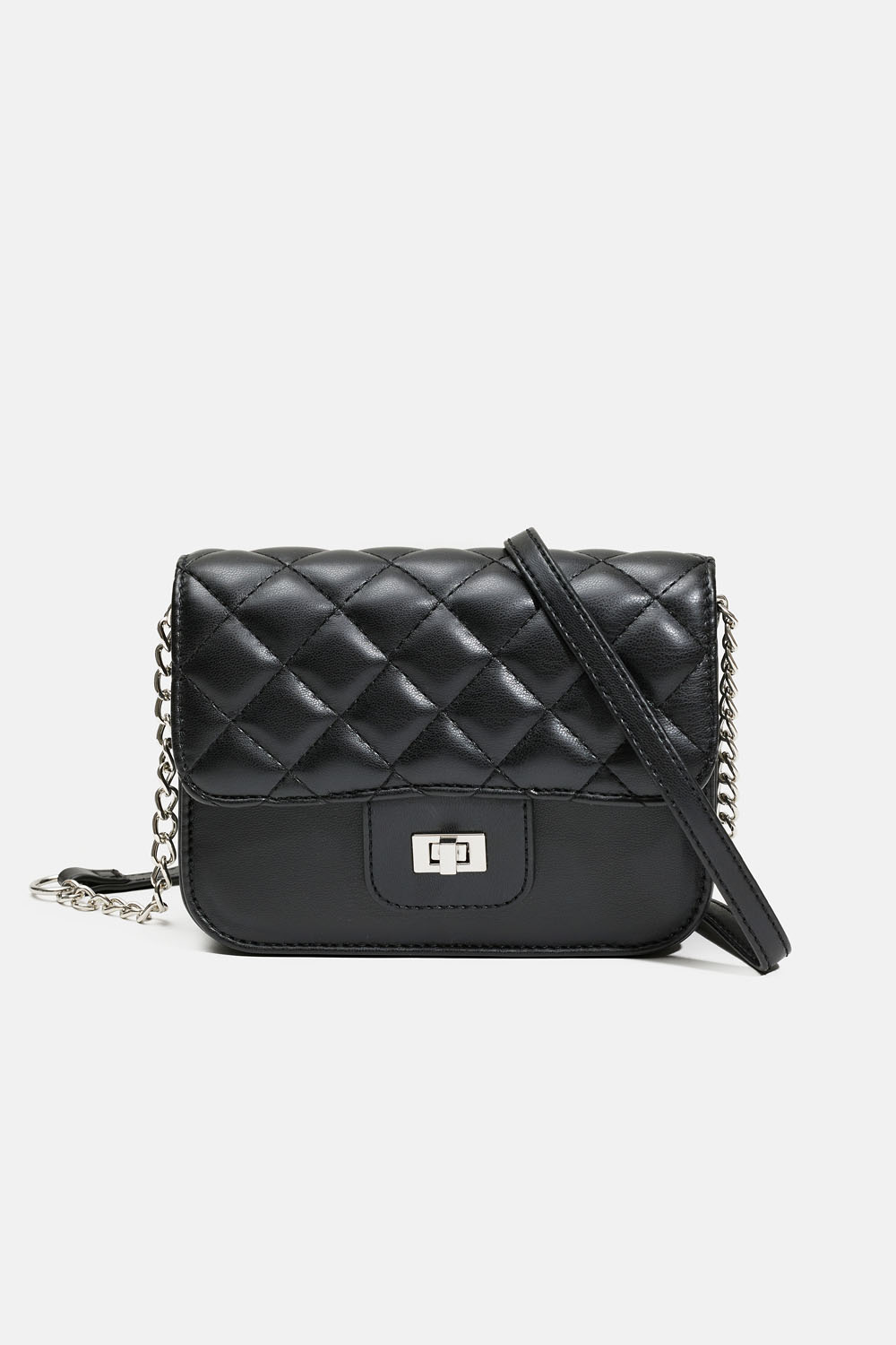 Svart quiltad handväska för barn med axelrem i silverfärgad kedja. Väskan har en stort fack som stängs med vridspänne.