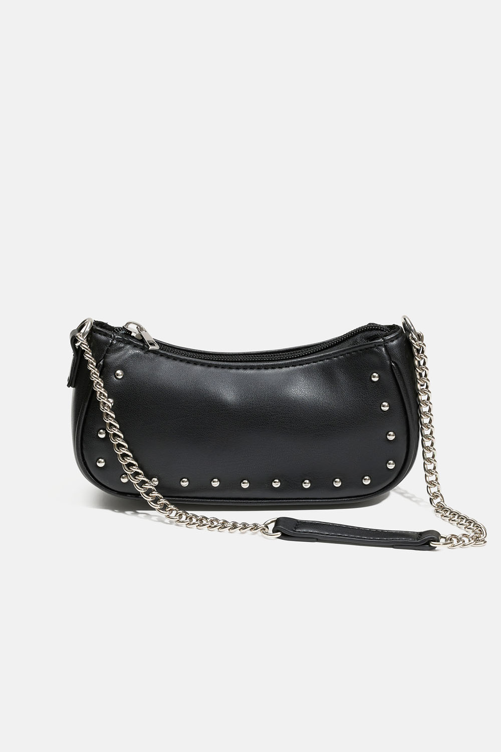 Svart baguetteväska i svart imitationsläder med rundade nitar och kedjeaxelrem. Väskan stängsn med en dragkedja.