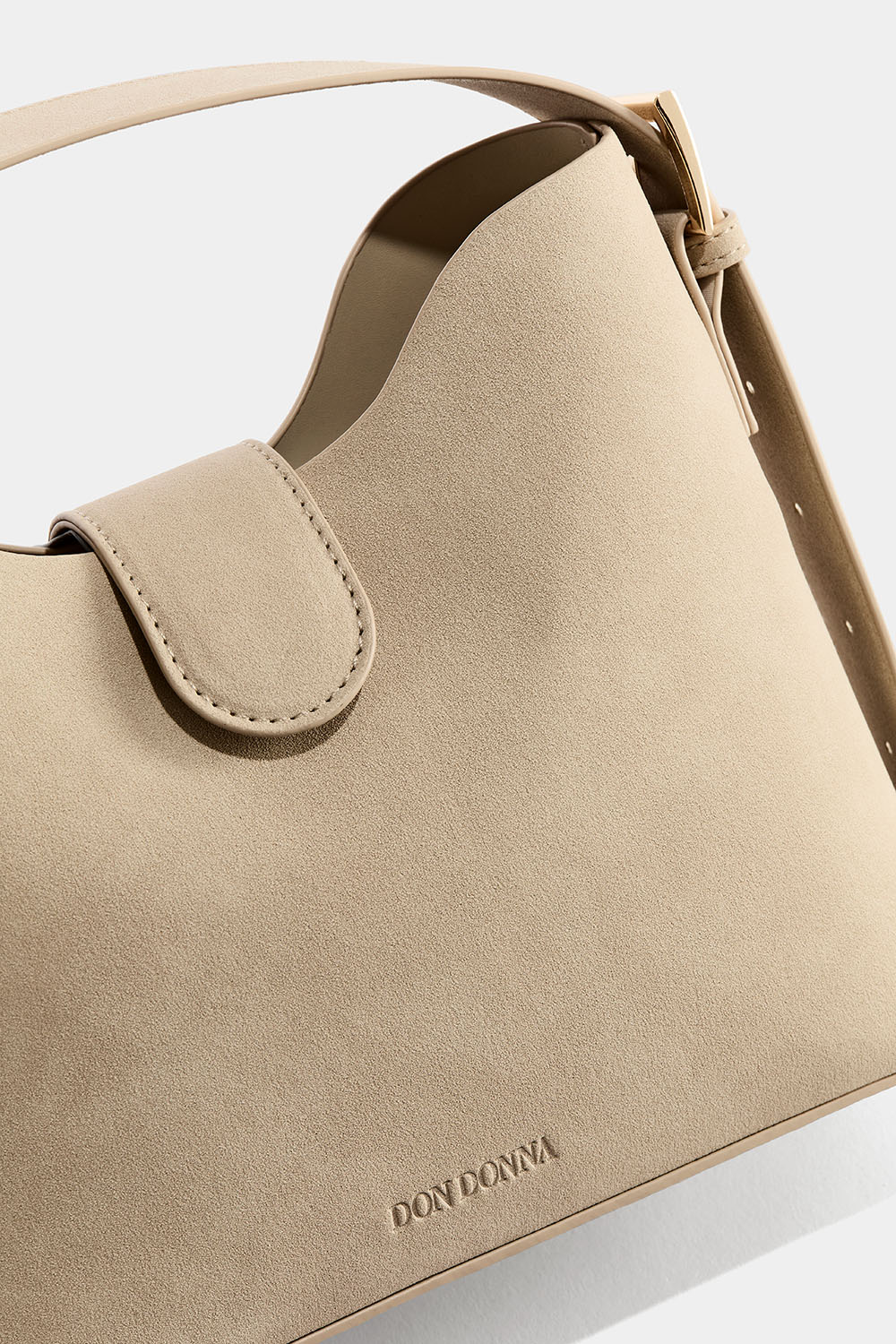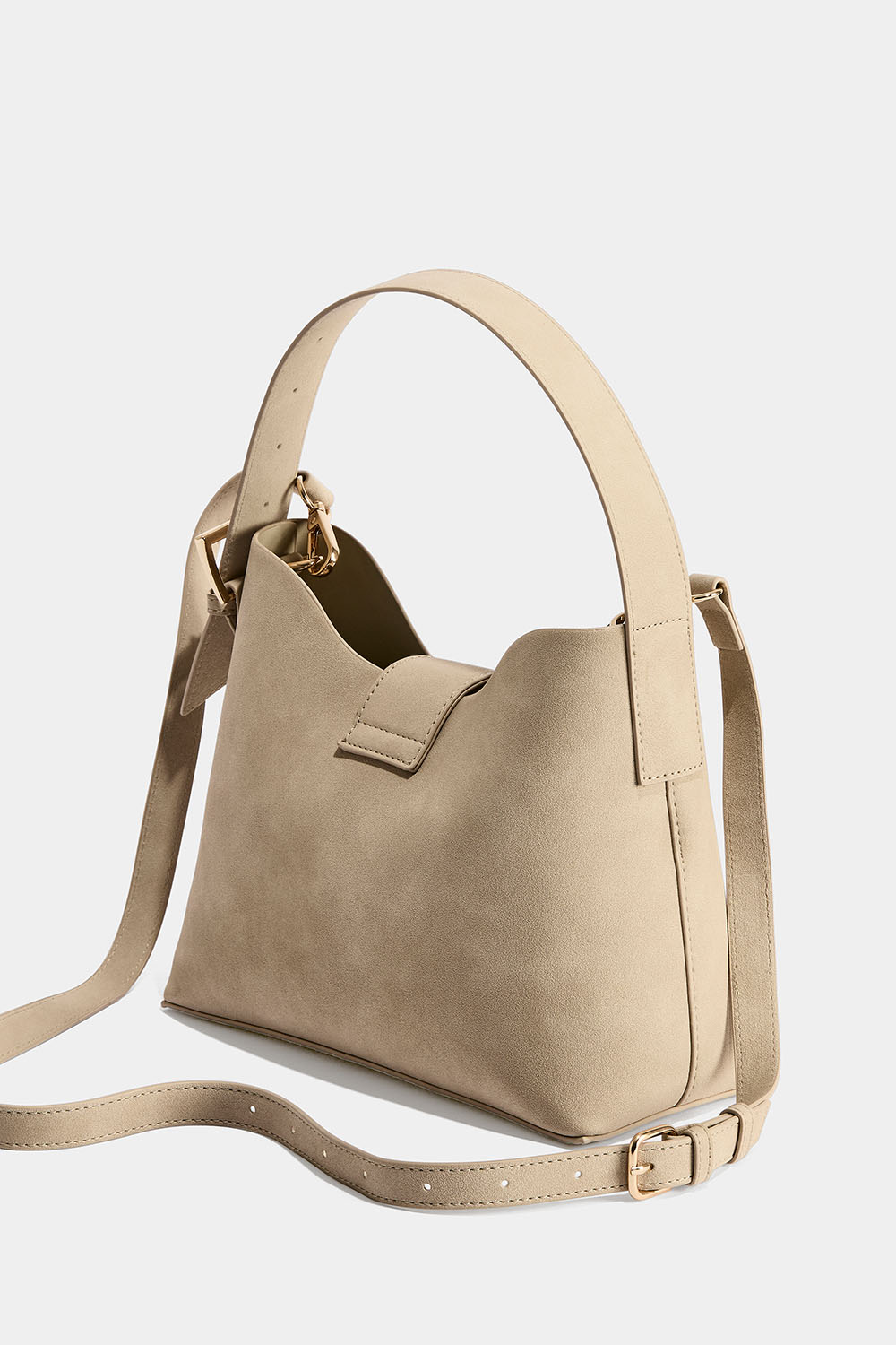 En liten beige väska i nubuck-imitation med lång avtagbar crossbody-rem, justerbart axelband och guldfärgade detaljer. Den har en mindre innerficka som kan stängas med dragkedja, som delar av väskan i två delar inuti. En perfekt vardagsväska och accessoar till jobbet eller en dag på stan.