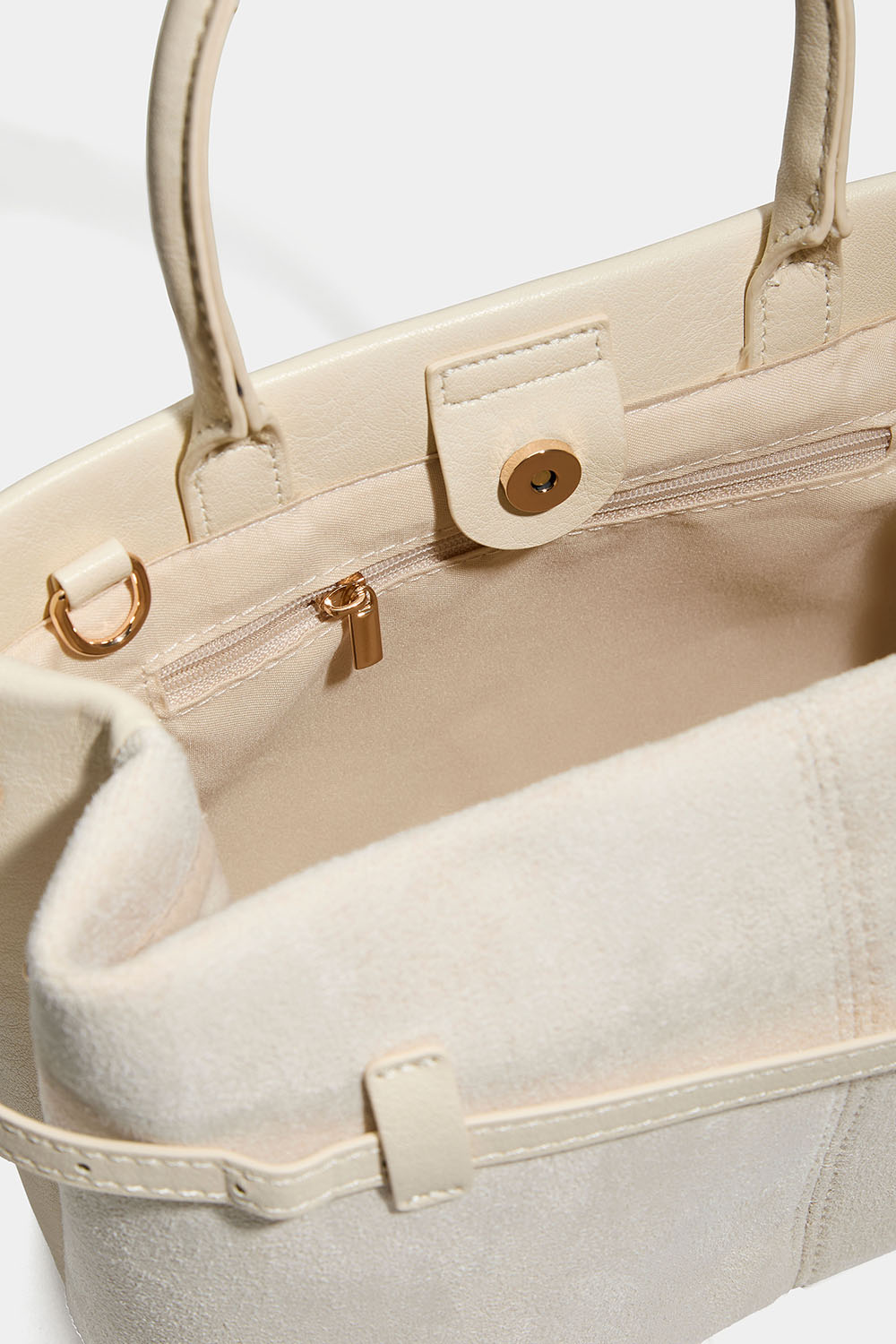 Liten beige rektangulär väska i mocka- och läderimitation med ett smalt bälte runt. Väskan har ett stort fack som stängs med magnet, och ett mindre fack med dragkedja. Det medföljer en justerbar axelrem.