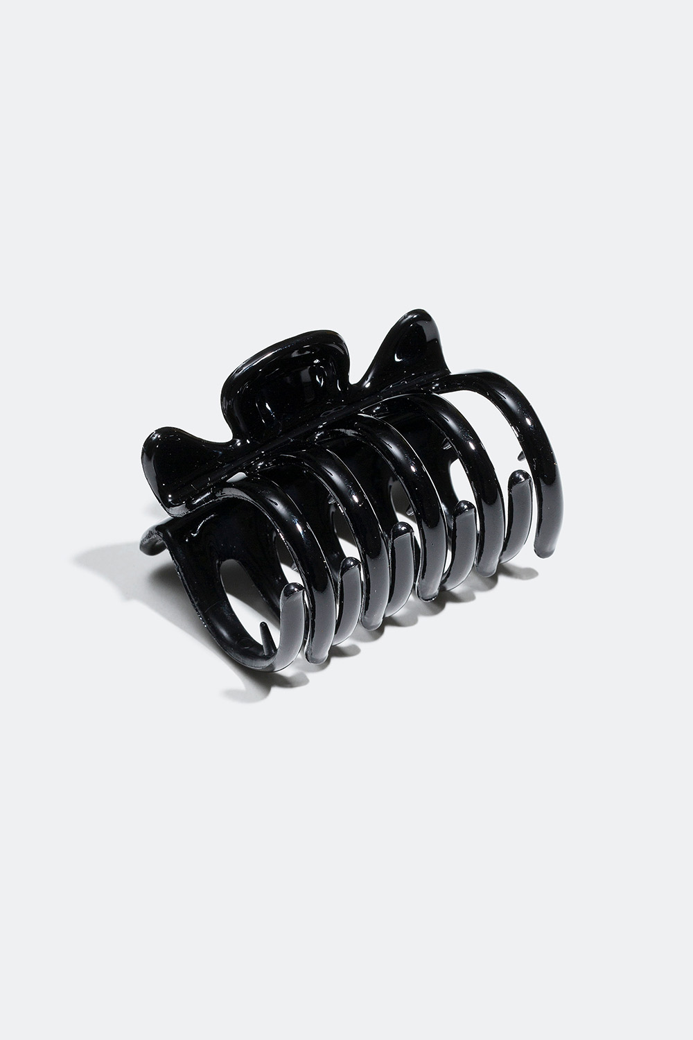 Liten hårklämma med blank yta fem piggar. Hårklämman kommer i två utföranden, en svart och en i svart och brunt melerat mönster.