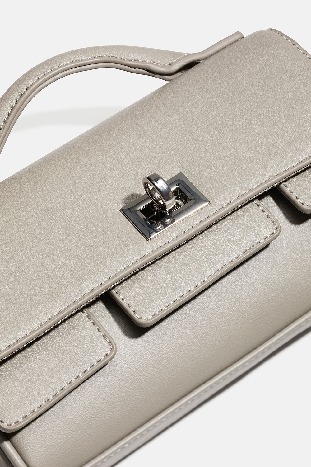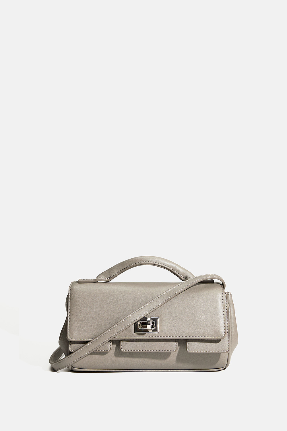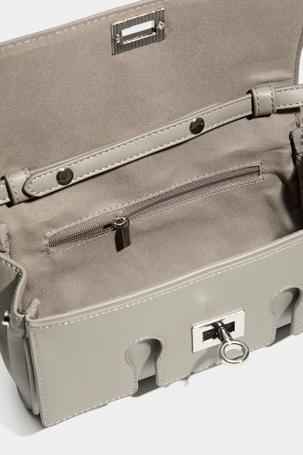 Liten väska i grå läderimitation med silverdetaljer. Väskan stängs med metallspänne och har ett mindre fack på insidan som stängs med dragkedja. Det medföljer en avtagbar axelrem.
