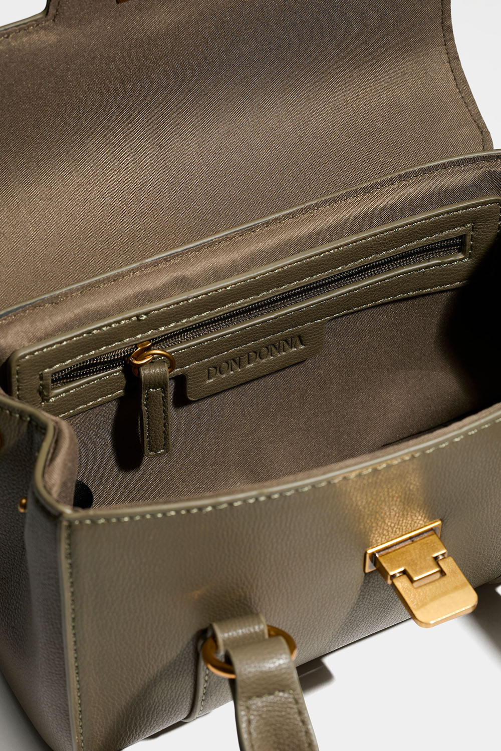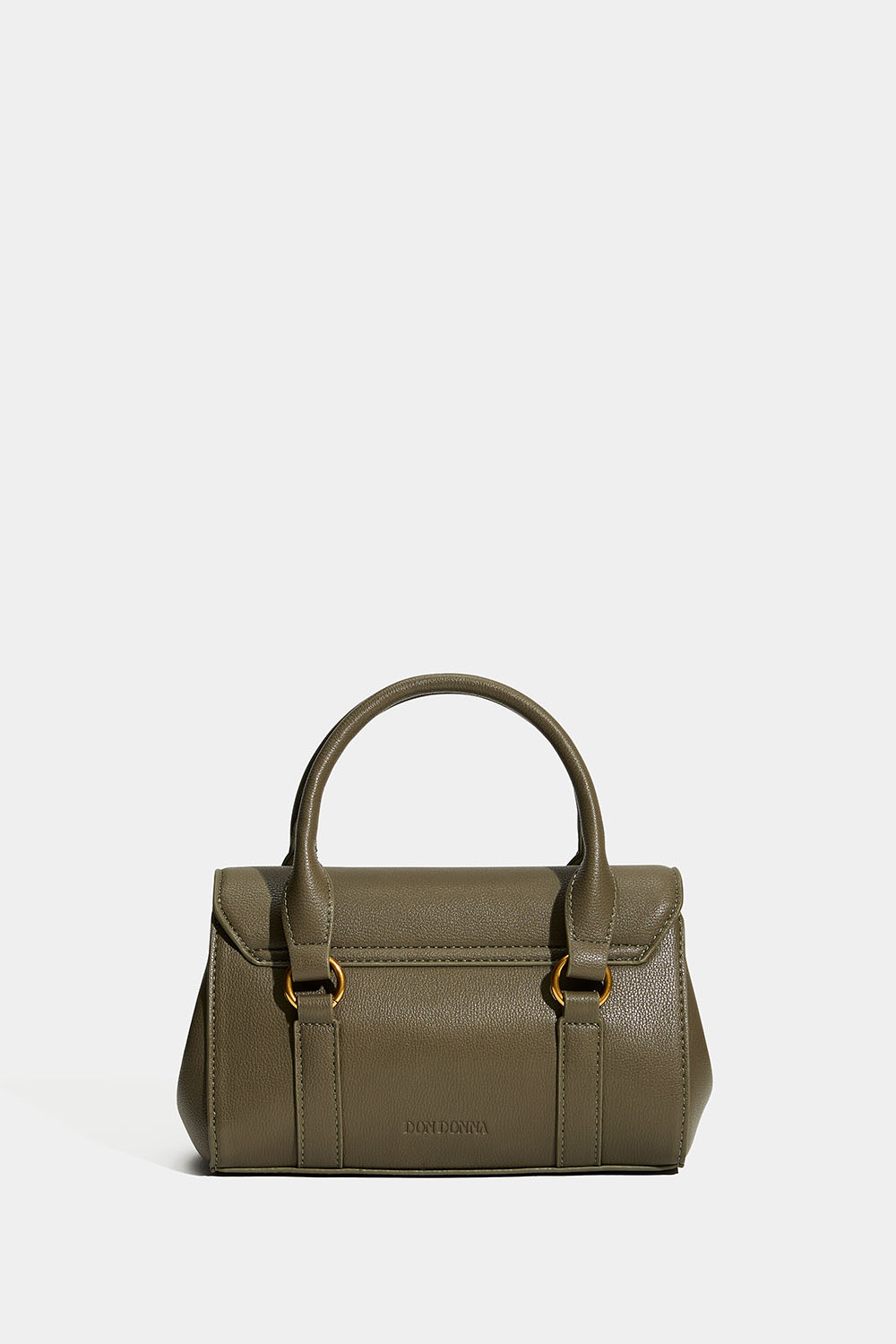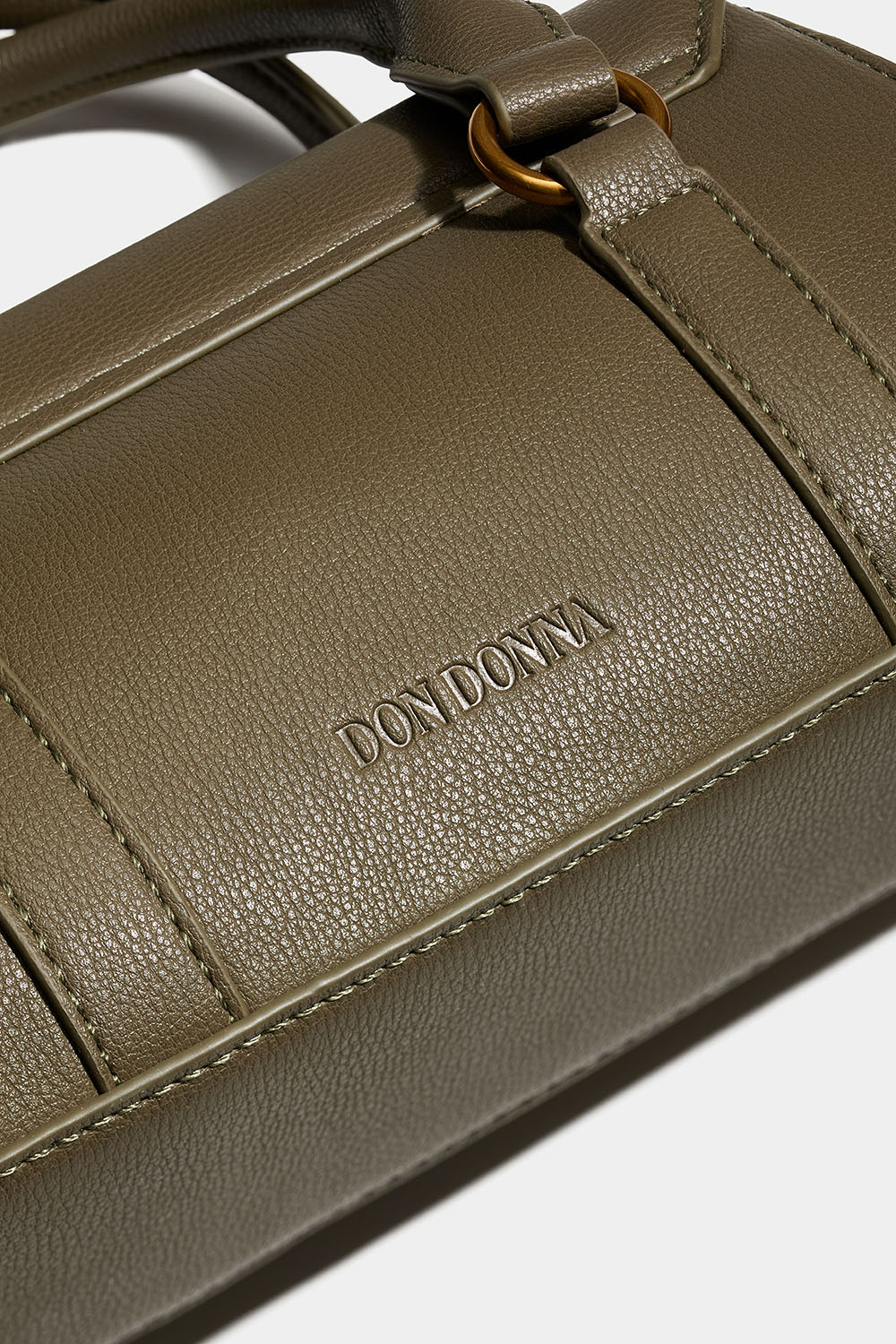 Liten grön handväska från Don Donna i läderimitation med Don Donna-loggan präglad på baksidan och detaljer i matt guldfärgad metall. Det medföljer även en längre axelrem, så att man även kan bära väskan som crossbody.