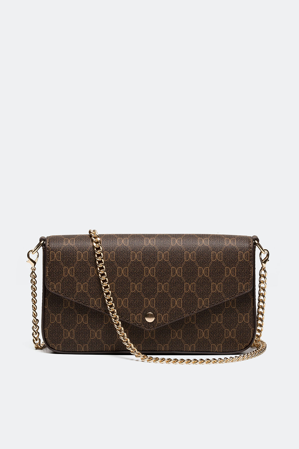 Liten brun väska med Don Donna-loggan printad och en avtagbar axelremskedja. En tidlös väska i perfekt storlek för dina viktigaste nödvändigheter.