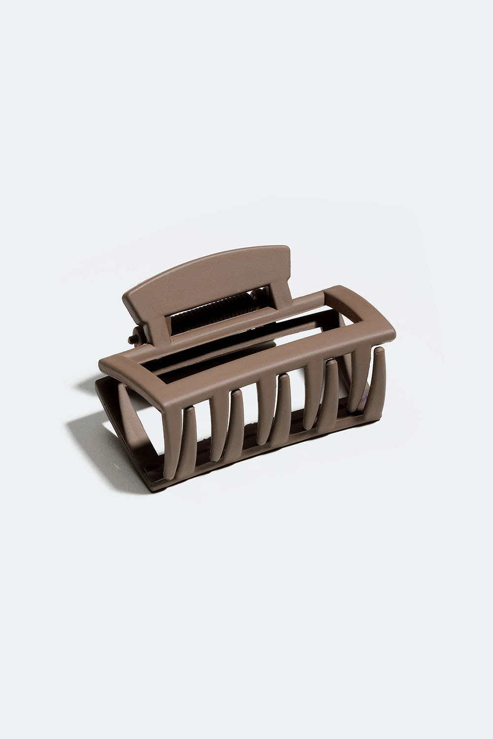 Liten rektangulär hårklämma i en matt brun färg. Hårklämmen har en stilren design med en extra utskärning och kommer i perfekt storlek för exempelvis halvuppsättningar. Undersidan av klämman är platt så att den ligger skönt mot huvudet. Snygg håraccessoar som skonsamt håller håret på plats.