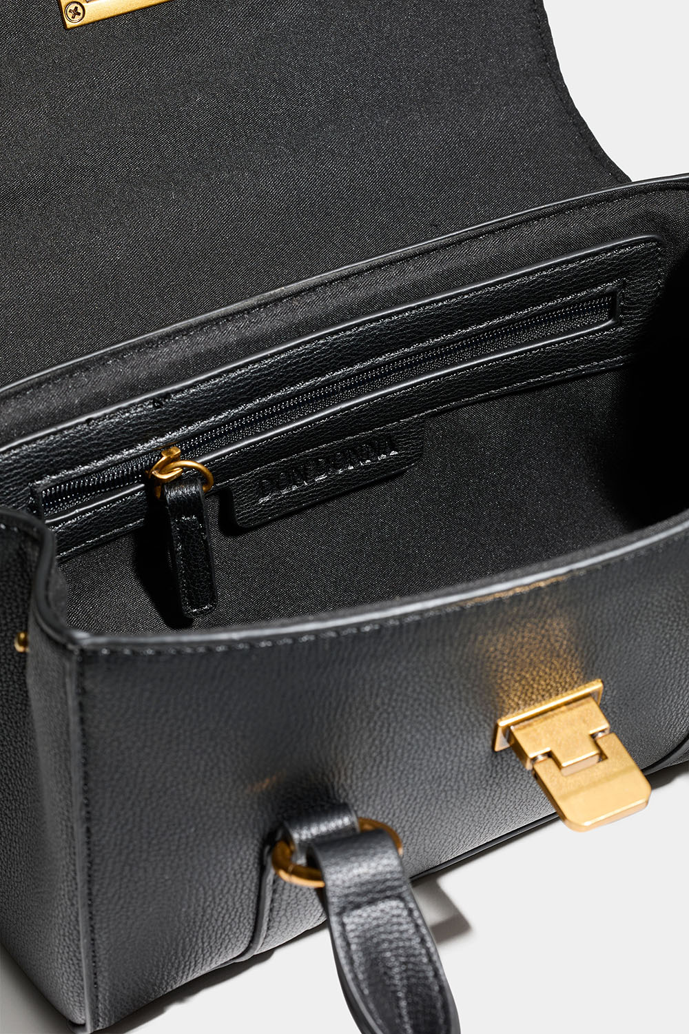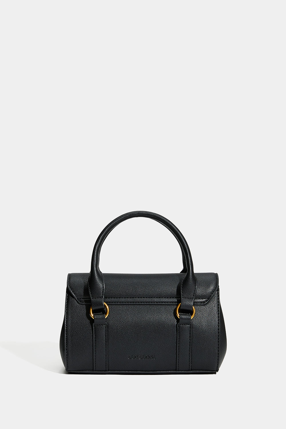 Liten svart handväska från Don Donna i läderimitation med Don Donna-loggan präglad på baksidan och detaljer i matt guldfärgad metall. Det medföljer även en längre axelrem, så att man även kan bära väskan som crossbody.
