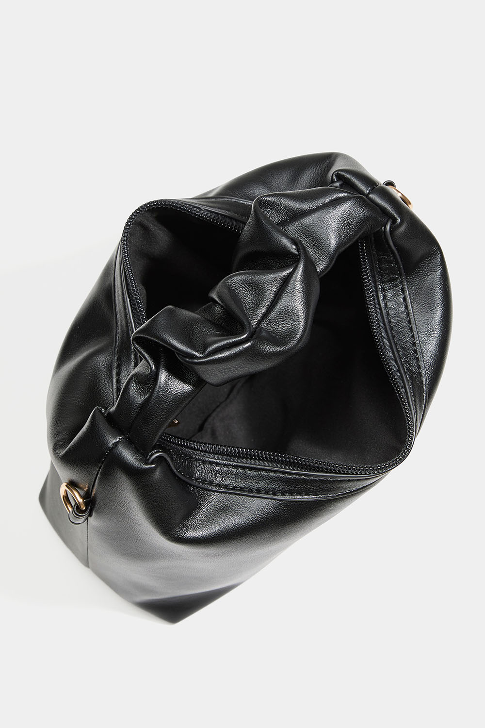 Liten väska i svart läderimitations med rynkat handtag. Väskan stängs med dragkedja och det medöljer en justerbar axelrem.